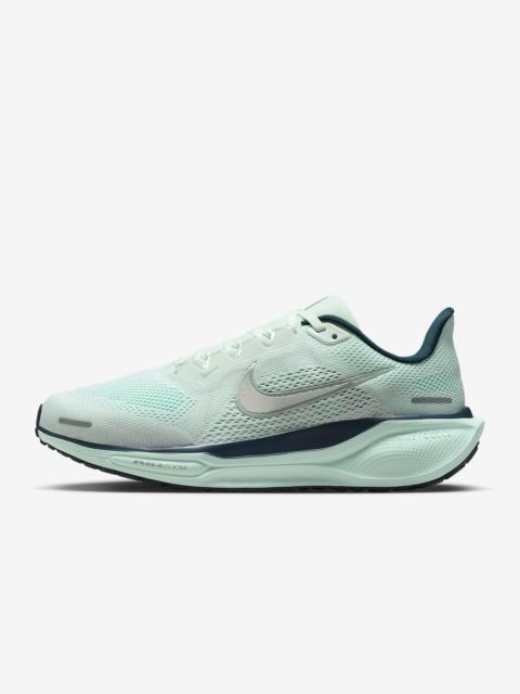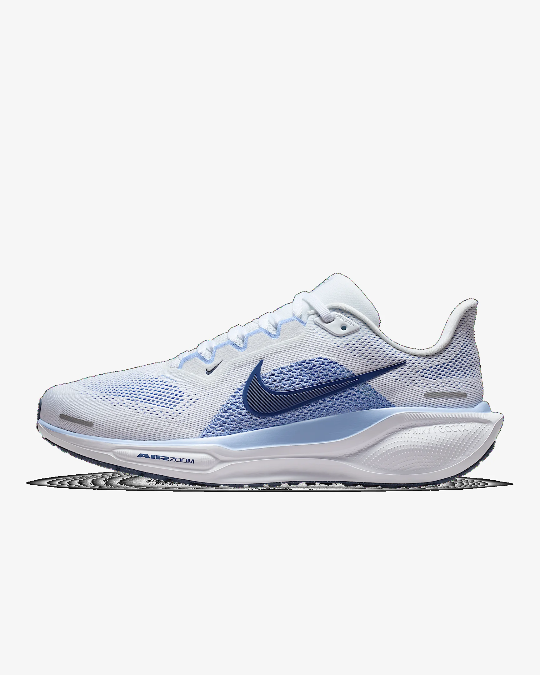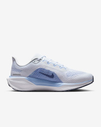 Responsive cushioning in the Pegasus provides an energized ride for everyday road running. Experience lighter-weight energy return with dual Air Zoom units and a ReactX foam midsole. Plus, improved engineered mesh on the upper decreases weight and increases breathability. More Benefits - ReactX foam midsole is 13% more responsive than previous React technology. - Engineered mesh upper is lighter and more breathable than the Pegasus 40. Product Details - Weight: Approx. 251g/8.9oz (Women's US 8) - Heel-to-toe drop: 10mm - MR-10 Last - Our best, most consistent fit (same as Pegasus 40) - Reflective details - Not intended for use as Personal Protective Equipment (PPE) - Shown: White/Aluminum/Football Grey/Diffused Blue - Style: FQ0965-108 SIZE & FIT Fits large; we recommend ordering a half size down