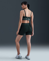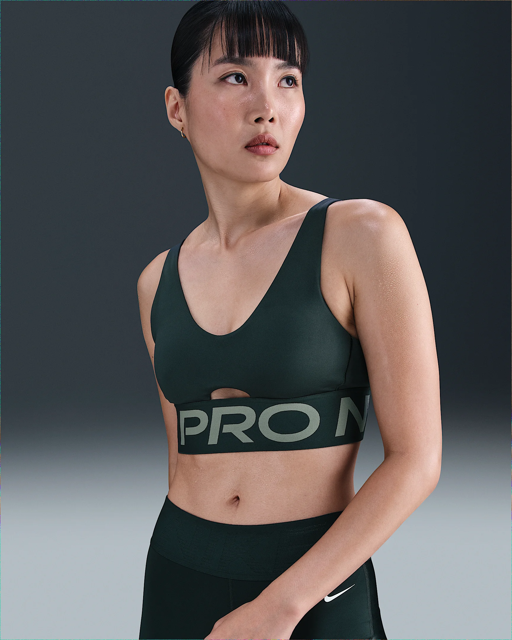 Show up and show off in this bold plunging sports bra. Minimized coverage still delivers a snug hold that helps keep everything in place, so you can keep pushing yourself. Plus, convertible straps and removable pads give you the freedom to style it your way. Product Details - Jacquard elastic chest band - Body: 72% polyester/28% spandex. Bottom hem: 70% polyester/18% spandex/12% nylon. Straps: 79% nylon/21% spandex. Lining: 88% polyester/12% spandex. Pad top fabric: 100% polyester. Pad: 100% polyurethane. Pad back fabric: 100% polyester. - Machine wash - Imported - Shown: Seaweed/Clay Green/White - Style: HF7324-390 SIZE & FIT Model is wearing size S Model height: 5′9″175cm Model bust: 32″81cm Tight fit: snug and form-fitting Medium support: feels ke a snug hold to keep everything in place