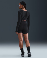 Work hard and stand out in these sweat-wicking biker shorts. Thicker and stretchier than our classic Nike Pro material, midweight fabric delivers a smoothing sensation while an extra wide waistband and sleek, shiny panels elevate your look. Product Details - Matte shine waistband - Swoosh logo on left hip - Body: 75% polyester/25% spandex. Panels: 73% nylon/27% spandex. Waistband: 89% nylon/11% spandex. - Machine wash - Imported - Shown: Black/Anthracite/White - Style: HV2366-010 SIZE & FIT Model is wearing size S and is 5′8″173cm Tight fit: snug and form-fitting Firm support: feels ke locked in support that keeps motion to a minimum High-Waisted: sits at or above your natural waist for more coverage