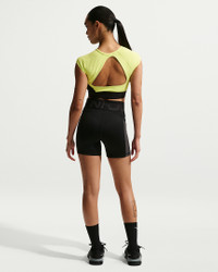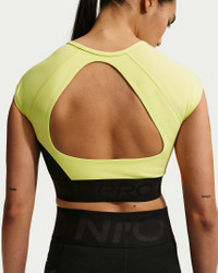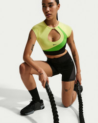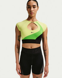 Work hard and stand out in this lightweight short-sleeve bra. Smooth, stretchy and sweat-wicking fabric helps keep you dry and comfortable while a keyhole design on the front and the back gives you a bold look and extra airflow. Its sewn-in pads resist shifting so you have reliable coverage, while medium support gives you a snug hold that helps keep everything in place. Benefits - Nike Dri-FIT technology moves sweat away from your skin for quicker evaporation, helping you stay dry and comfortable. - Built-in medium support gives you a snug hold that helps keep everything in place. - Lightweight and stretchy, the smooth fabric dries quickly. - Keyholes on the front and back help keep you cool as you work up a sweat. Product Details - Body: 74% polyester/26% spandex. Front Lining: 81% polyester/19% spandex. Back Lining: 74% polyester/26% spandex. Pad Back Fabric: 100% polyester. Pad: 100% polyurethane. - Machine wash - Imported - Shown: Mean Green/Black/Light Lemon Twist/Black - Style: IQ0366-307 SIZE & FIT Tight fit: snug and form-fitting Medium support: feels ke a snug hold to keep everything in place