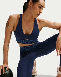 Go hard, stay cool. Thicker and stretchier than our classic Nike Pro material, this sweat-wicking bra pairs medium support with removable pads so you have reliable coverage. Benefits - Nike Dri-FIT technology moves sweat away from your skin for quicker evaporation, helping you stay dry and comfortable. - Medium support gives you a snug hold. - An extra-wide chest band holds you snugly without pinching or binding. Product Details - Removable pads - Racerback design - Body: 75% polyester/25% spandex; Bottom Hem: 82% polyester/18% spandex; Lining: 88% polyester/12% spandex; Interlining: 84% polyester/16% spandex; Pad Top/Back Fabric: 100% Polyester; Pad: 100% Polyurethane. - Machine wash - Imported - Shown: Midnight Navy/Mystic Navy/White - Style: IB9896-410 SIZE & FIT Model is wearing size S Model Height: 5'3"160cm Model bust: 33"84cm Tight fit: snug and form-fitting Medium support: feels ke a snug hold to keep everything in place