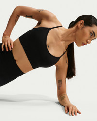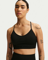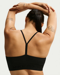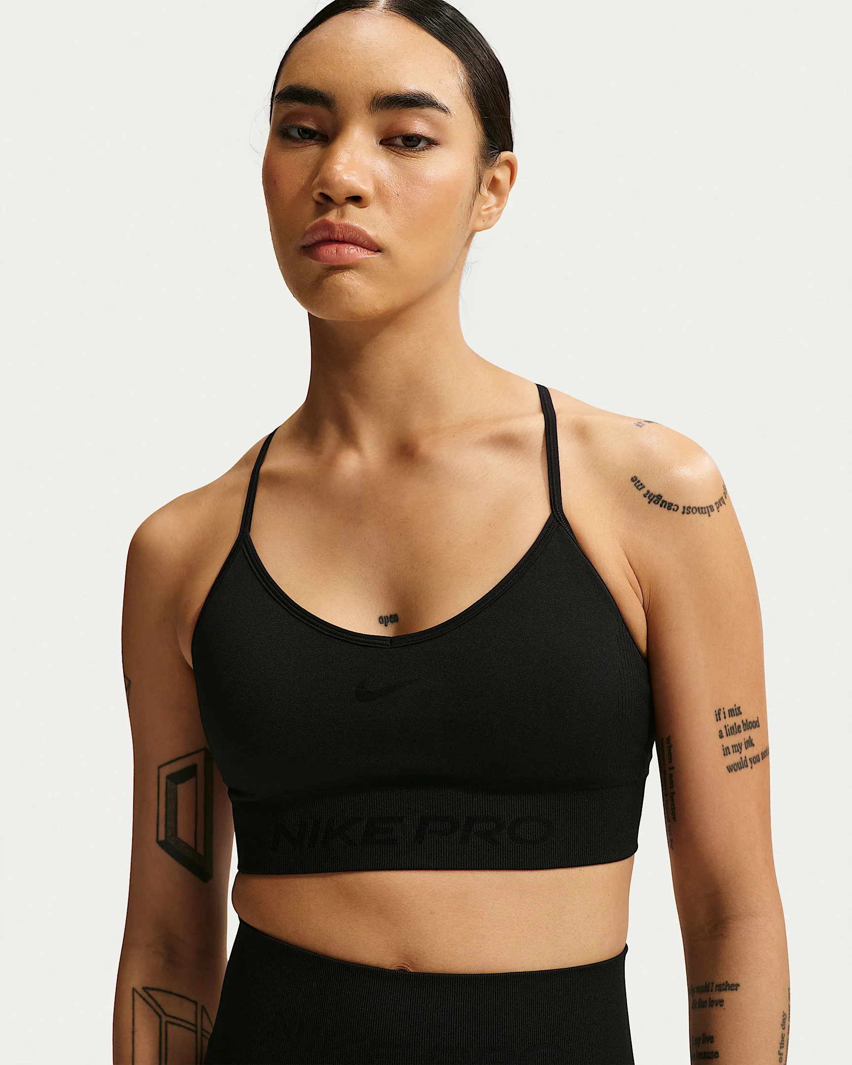 Soft and lightweight, this bra features stretchy, sweat-wicking fabric which dries quickly to help you stay ready when your workout heats up. Ribbed panels provide a sculpting fit while its light support provides a gentle hold with plenty of freedom perfect for low-impact workouts. Benefits - Nike Dri-FIT technology moves sweat away from your skin for quicker evaporation, helping you stay dry and comfortable. - Light support gives you a gentle hold with plenty of freedom that's great for low-impact workouts or all-day comfort. - Removable pads let you choose your coverage. - Soft and stretchy fabric has strategically placed ribbed zones for shaping. Product Details - Ribbed panels on sides - Nike Pro branding on chest band - Body; 47% polyester/42% nylon/11% spandex. Bottom hem; 51% polyester/28% nylon/21% spandex. Lining; 54% nylon/30% polyester/16% spandex. Pad rop/back fabric; 100% polyester. Pad; 100% polyurethane. - Machine Wash - Imported - Shown: Black - Style: IB9843-010 SIZE & FIT Model is wearing size S Model Height: 5'3"160cm Model bust: 33"84cm Tight fit: snug and form-fitting Light support: feels ke a soft hug with plenty of freedom