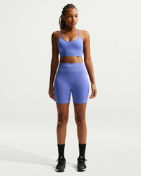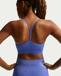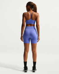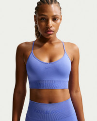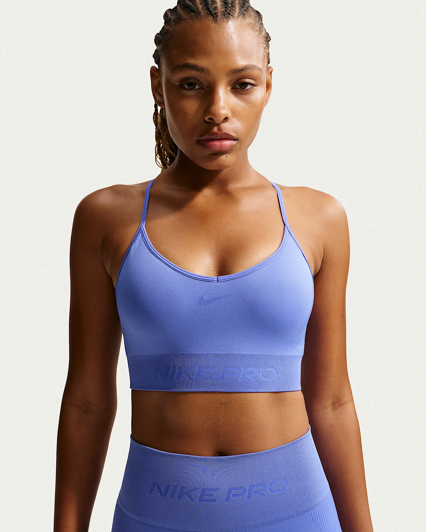 Soft and lightweight, this bra features stretchy, sweat-wicking fabric which dries quickly to help you stay ready when your workout heats up. Ribbed panels provide a sculpting fit while its light support provides a gentle hold with plenty of freedom perfect for low-impact workouts. Benefits - Nike Dri-FIT technology moves sweat away from your skin for quicker evaporation, helping you stay dry and comfortable. - Light support gives you a gentle hold with plenty of freedom that's great for low-impact workouts or all-day comfort. - Removable pads let you choose your coverage. - Soft and stretchy fabric has strategically placed ribbed zones for shaping. Product Details - Ribbed panels on sides - Nike Pro branding on chest band - Body; 47% polyester/42% nylon/11% spandex. Bottom hem; 51% polyester/28% nylon/21% spandex. Lining; 54% nylon/30% polyester/16% spandex. Pad rop/back fabric; 100% polyester. Pad; 100% polyurethane. - Machine Wash - Imported - Shown: Sapphire - Style: IB9843-570 SIZE & FIT Model is wearing size S Model height: 5′11″179cm Model bust: 33″84cm Tight fit: snug and form-fitting Light support: feels ke a soft hug with plenty of freedom
