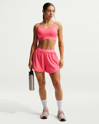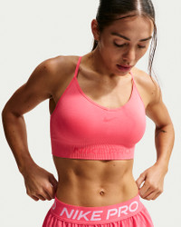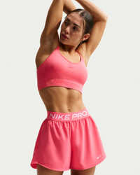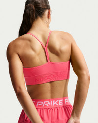 Soft and lightweight, this bra features stretchy, sweat-wicking fabric which dries quickly to help you stay ready when your workout heats up. Ribbed panels provide a sculpting fit while its light support provides a gentle hold with plenty of freedom perfect for low-impact workouts. Benefits - Nike Dri-FIT technology moves sweat away from your skin for quicker evaporation, helping you stay dry and comfortable. - Light support gives you a gentle hold with plenty of freedom that's great for low-impact workouts or all-day comfort. - Removable pads let you choose your coverage. - Soft and stretchy fabric has strategically placed ribbed zones for shaping. Product Details - Ribbed panels on sides - Nike Pro branding on chest band - Body; 47% polyester/42% nylon/11% spandex. Bottom hem; 51% polyester/28% nylon/21% spandex. Lining; 54% nylon/30% polyester/16% spandex. Pad rop/back fabric; 100% polyester. Pad; 100% polyurethane. - Machine Wash - Imported - Shown: Sea Coral - Style: IB9843-897 SIZE & FIT Model is wearing size S Model height: 5′6″168cm Model bust: 32″81cm Tight fit: snug and form-fitting Light support: feels ke a soft hug with plenty of freedom