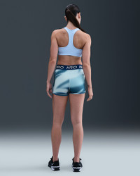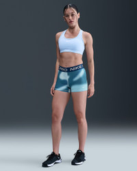 Lightweight and stretchy, these smooth Nike Pro shorts dry quickly, helping keep you ready to sweat. The soft elastic waistband stays put so you can go hard feeling limitless. Benefits - Nike Dri-FIT technology moves sweat away from your skin for quicker evaporation, helping you stay dry and comfortable. - Jacquard elastic waistband sits snugly against skin without pinching or binding. Product Details - 3" inseam - Body: 83% polyester/17% spandex. Waistband: 63% nylon/21% polyester/16% spandex - Machine wash - Imported - Shown: Light Armory Blue/Celestine Blue/Psychic Blue - Style: IM8730-478 SIZE & FIT Tight fit: snug and form-fitting Medium support: feels ke a snug hold to keep everything in place Mid-Rise: sits just below your natural waist (smallest part of your torso)
