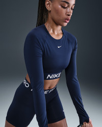 Get your sweat on in this cropped Nike Pro top. Lightweight and stretchy, the smooth fabric dries quickly to help you stay ready when your workout heats up. With a body-hugging fit and soft jacquard elastic band at the hem, you can feel secure as you crush your goals. Product Details - 83% polyester/17% spandex - Machine wash - Imported - Shown: Midnight Navy/White - Style: FV5484-410 SIZE & FIT Model is wearing size S and is 5′10″177cm Tight fit: snug and form-fitting