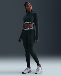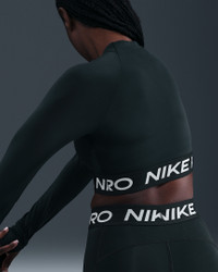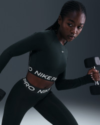 Get your sweat on in this cropped Nike Pro top. Lightweight and stretchy, the smooth fabric dries quickly to help you stay ready when your workout heats up. With a body-hugging fit and soft jacquard elastic band at the hem, you can feel secure as you crush your goals. Product Details - 83% polyester/17% spandex - Machine wash - Imported - Shown: Seaweed/White - Style: FV5484-390 SIZE & FIT Model is wearing size S and is 5′8″173cm Tight fit: snug and form-fitting