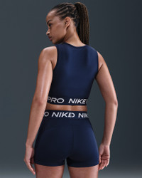 Get your sweat on in this cropped Nike Pro tank. Lightweight and stretchy, the smooth fabric dries quickly to help you stay ready when your workout heats up. With a body-hugging fit and soft jacquard elastic band at the hem, you can feel secure as you crush your goals. Product Details - Body: 83% polyester/17% spandex. Waistband: 63% nylon/21% polyester/16% spandex. - Machine wash - Imported - Shown: Midnight Navy/White - Style: FZ3615-410 SIZE & FIT Model is wearing size S and is 5′10″177cm Tight fit: snug and form-fitting