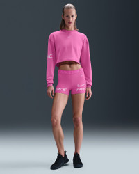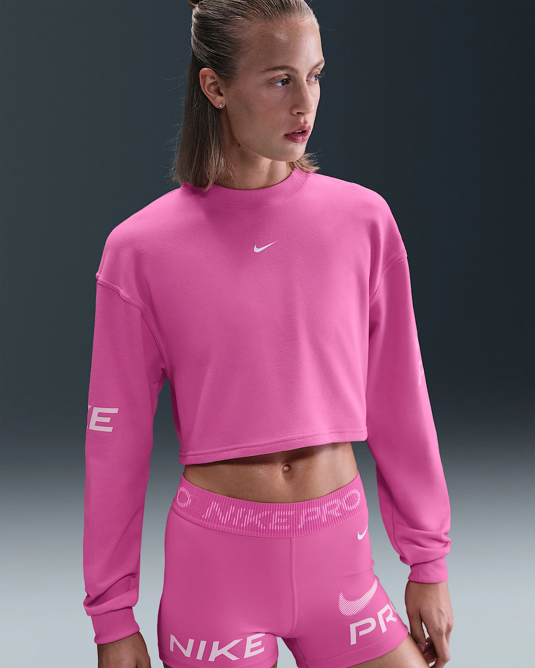 Warm up and work out in this roomy, sweat-wicking top. It's made with midweight French terry fabric (with unbrushed loops on the inside) that's structured, breathable and soft. Product Details - Cropped length - Printed Swoosh logo on chest - Printed graphics on sleeves - Body: 58% polyester/37% cotton/5% spandex. Rib: 56% polyester/41% cotton/3% spandex. - Machine wash - Imported - Shown: Playful Pink/Pink Foam/White - Style: HV3591-675 SIZE & FIT Model is wearing size S and is 5′11″180cm Loose fit: roomy and relaxed