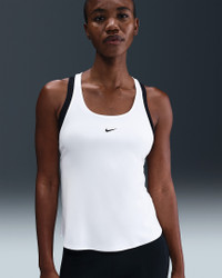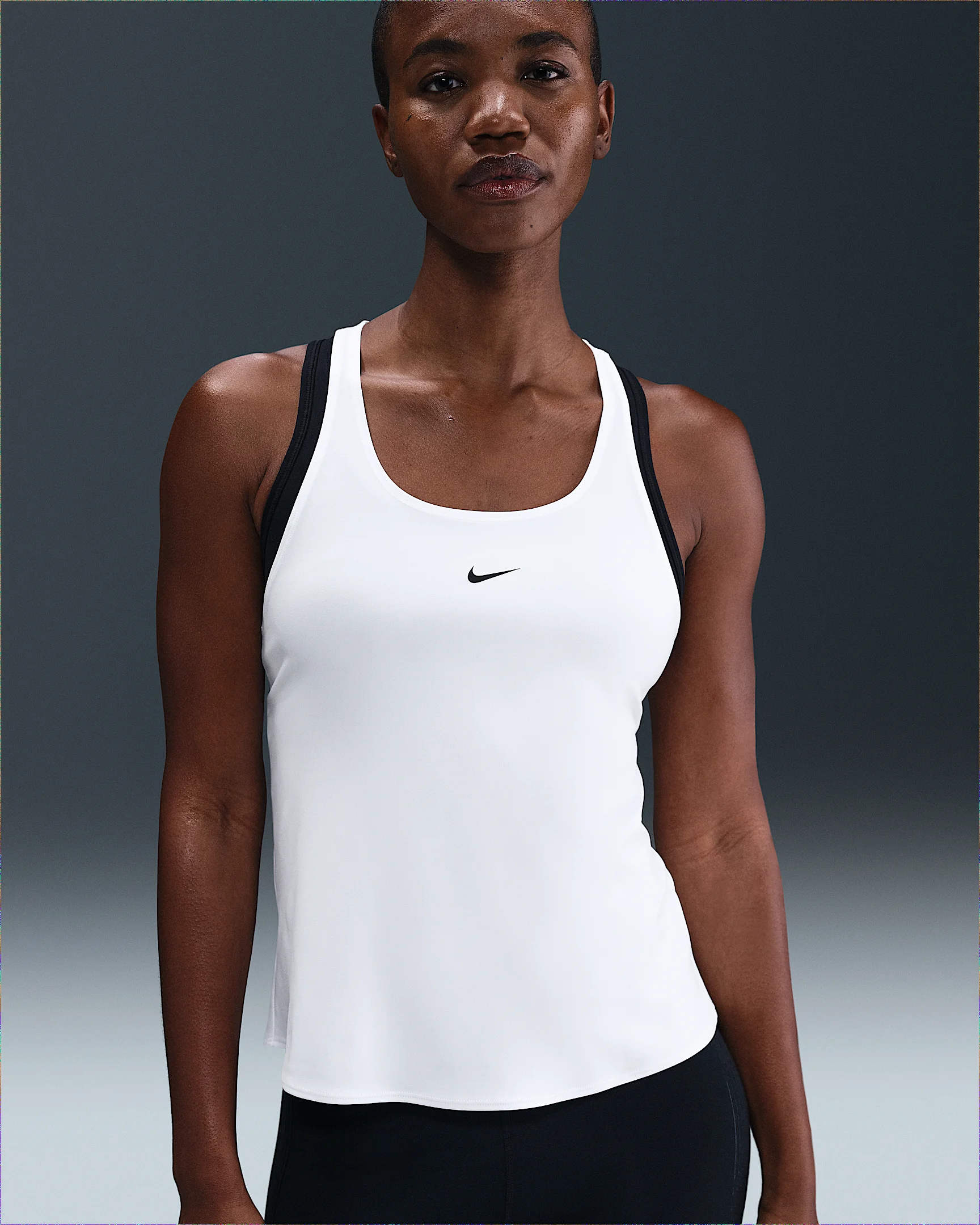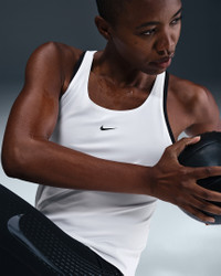 Ready to sweat? This tank's ultralightweight, silky-smooth fabric dries quickly to help you stay cool when your workout heats up. An open back allows moisture to escape. Product Details - Printed Swoosh logo on chest - Branded elastic straps - Body: 87-88% polyester/12-13% spandex. Elastic: 73% polyester/26% spandex/1% nylon. - Material percentages may vary. Check label for actual content. - Machine wash - Imported - Shown: White/Black - Style: IB9900-100 SIZE & FIT Model is wearing size S and is 5′11″180cm Sm fit: sleek and tailored
