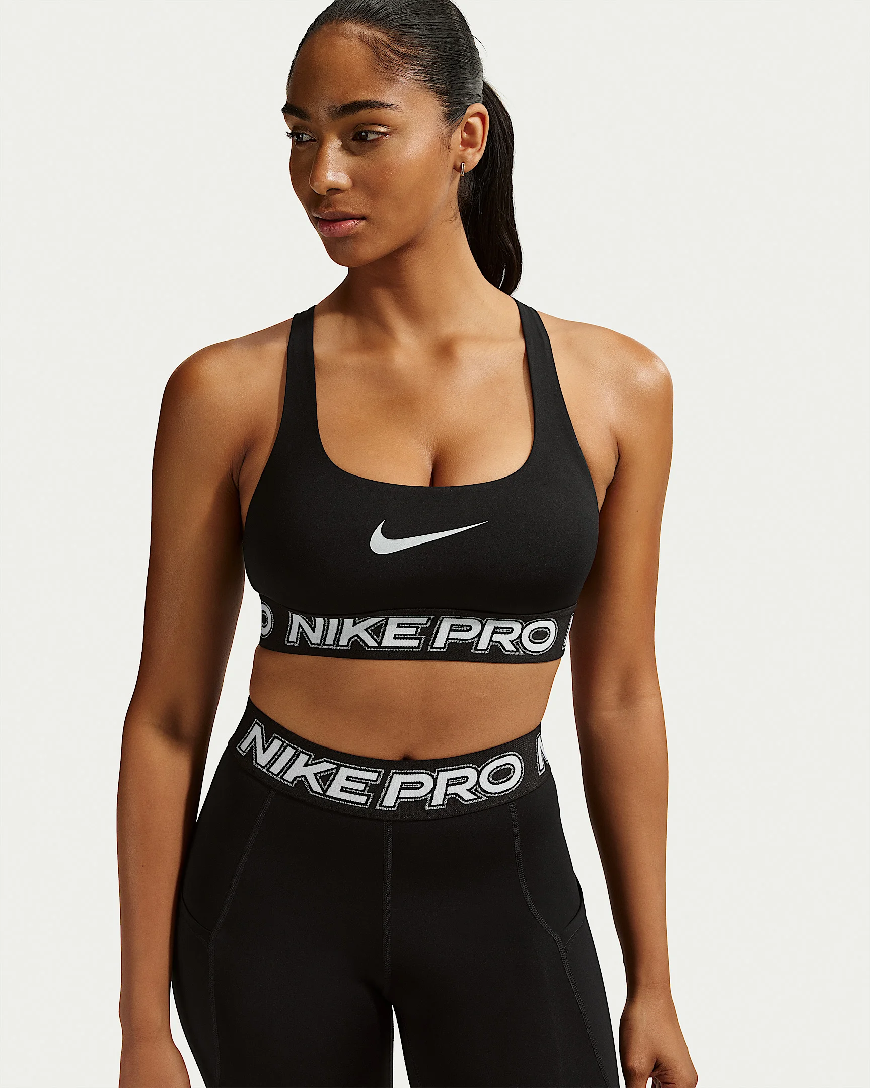 Sweat it out in this Nike Pro sports bra. Lightweight and stretchy, the smooth fabric dries quickly to help you stay comfortable when your workout heats up. A gentle hold and non-padded design gives you plenty of freedom to do you. Benefits - Nike Dri-FIT technology moves sweat away from your skin for quicker evaporation, helping you stay dry and comfortable. - Lightweight and stretchy, the smooth fabric dries quickly - A soft jacquard elastic chest band sits snugly against your skin without pinching or binding. Product Details - Body/Lining: 83% polyester/17% spandex; Bottom Hem: 72% polyester/22% nylon/6% spandex; Lining: 83% polyester/17% spandex - Machine Wash - Imported - Shown: Black/White/Metallic Silver - Style: IF0214-010 SIZE & FIT Tight fit: snug and form-fitting Light support: feels ke a soft hug with plenty of freedom