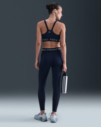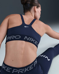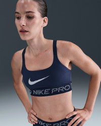 Sweat it out in this Nike Pro sports bra. Lightweight and stretchy, the smooth fabric dries quickly to help you stay comfortable when your workout heats up. A gentle hold and non-padded design gives you plenty of freedom to do you. Product Details - Printed Swoosh logos on front and back - Body/Lining: 83% polyester/17% spandex. Bottom hem: 90% polyester/10% spandex. Straps: 73% nylon/27% spandex. - Machine wash - Imported - Shown: Midnight Navy/Football Grey/White - Style: IF3973-410 SIZE & FIT Model is wearing size S Model height: 5′10″178cm Model bust: 34″86cm Tight fit: snug and form-fitting Light support: feels ke a soft hug with plenty of freedom