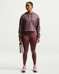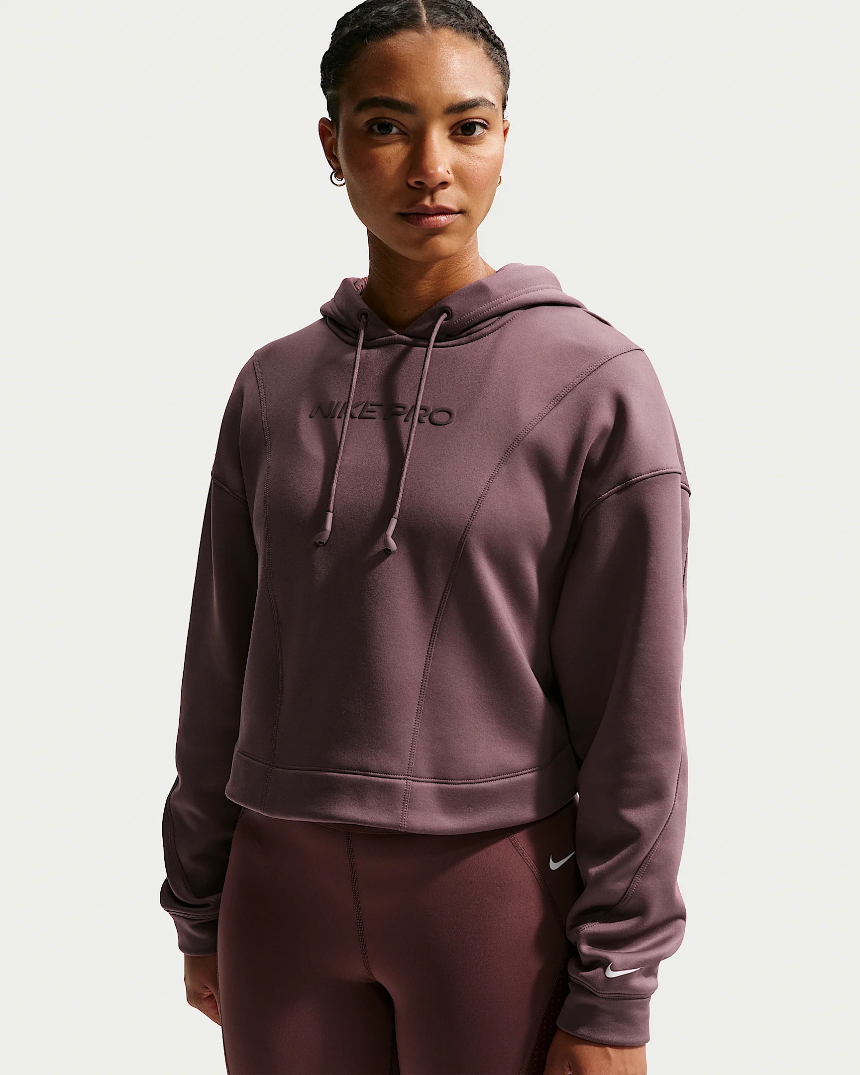 Warm up and work out in this spacious, heat-regulating hoodie. Soft and stretchy fabric feels cozy thanks to its supersmooth face on the outside and soft brushed face on the inside. Silicone drawcord tips provide a place to hold your earbuds. More Benefits - Specially designed drawcord with silicone holders can store certain earbuds. Product Details - Swoosh logo on sleeve - Nike Pro branding at chest - Body: 91% polyester/9% spandex. Hood Lining: 75% polyester/13% cotton/12% rayon. - Machine wash - Imported - Shown: Tattoo/White - Style: II3866-502 SIZE & FIT Model is wearing size S and is 5′10″178cm Oversized fit: exaggerated and spacious