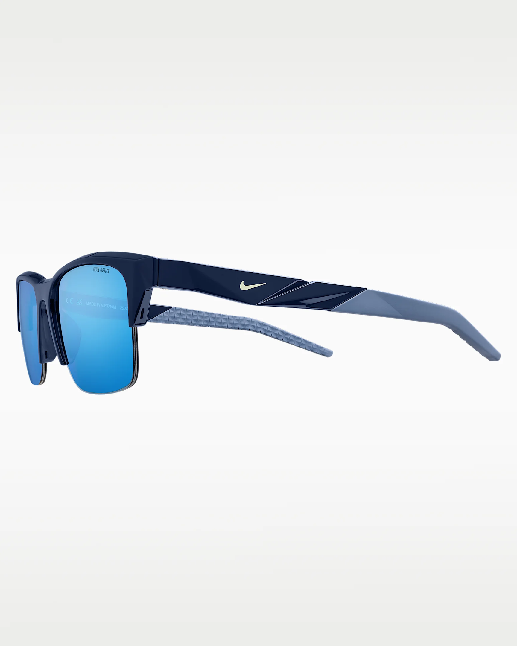 Half the frame, twice the character. The sculpted faceting at the temples and outer edges adds quiet dimension to the Nike Radeon Ware for a crisp, confident look that feels right whether you’re in the stands or out and about. Benefits - Frame size: 57mm lens width; 17mm bridge width; 145mm temple length - Nike Max Optics provide precise vision from all angles. - 4-base shield and slim profile provide everyday coverage. - Adjustable temples with textured silicone sleeves give enhanced grip and optimal fit. Product Details - Injected frame material is derived from at least 40% castor bean oil. - Prescription-friendly frame. - 100% UVA/UVB protection. - Shown: Midnight Navy/Blue - Style: IR4369X-410