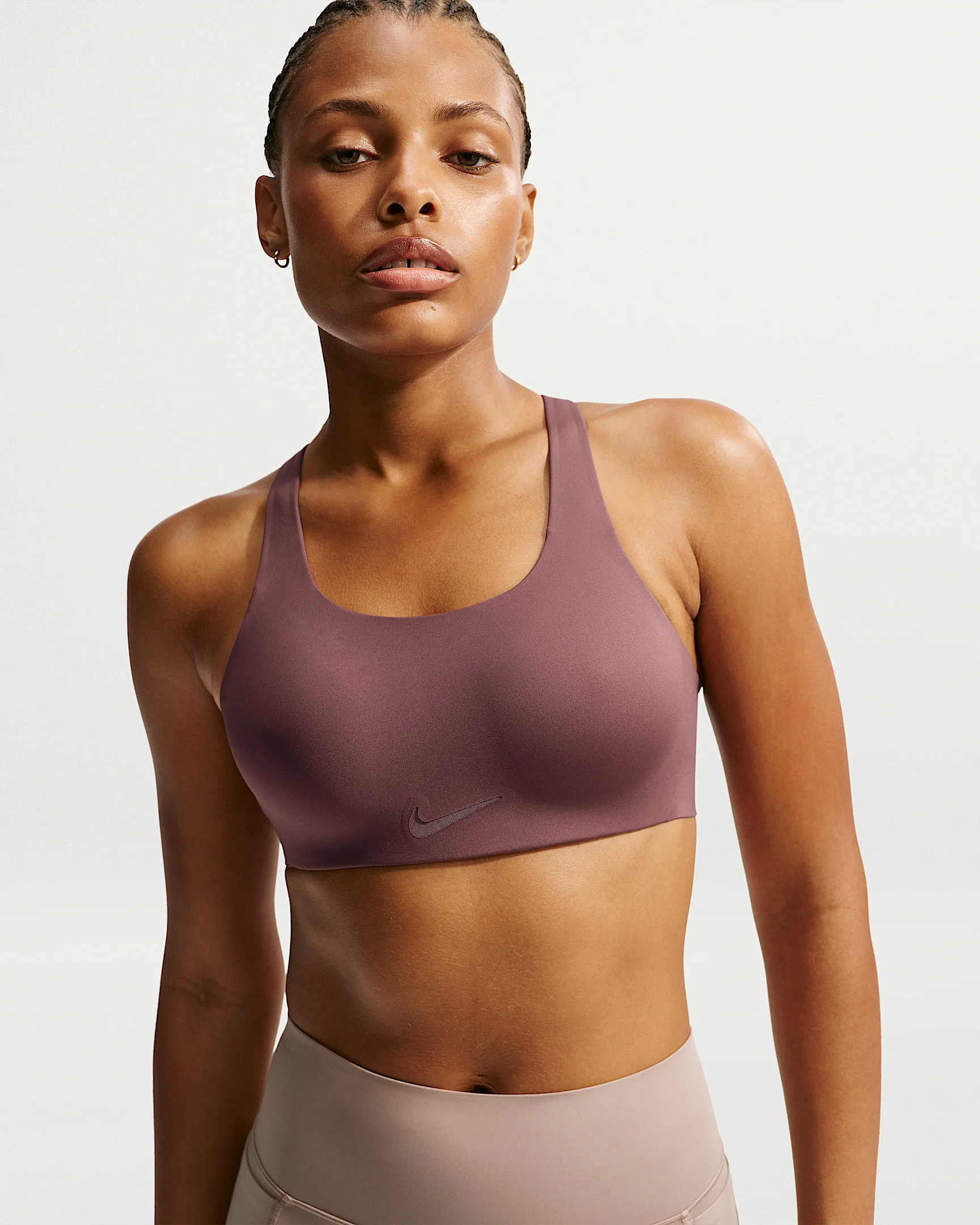 A bra with ultrahigh support that shows up and shows off? Challenge accepted. Molded cups and embedded underwire comfortably hold you in. And for flexible, breathable reinforcement, we added foam padding. The result is the Nike Rival—offering our highest level of support yet for your most intense workouts. More Benefits - Adjustable straps are padded to help prevent digging. - Racerback design allows for unrestricted movement. Product Details - Hook-and-eye closure - Body/Panels lining: 70% polyester/30% spandex. Mesh: 81% polyester/19% spandex. Pad back fabric: 100% polyester. Pad: 100% polyurethane. - Machine wash - Imported - Shown: Tattoo - Style: FQ7387-502 SIZE & FIT Model is wearing size S Model height: 5'11""179cm Model bust: 33""84cm Tight fit: snug and form-fitting