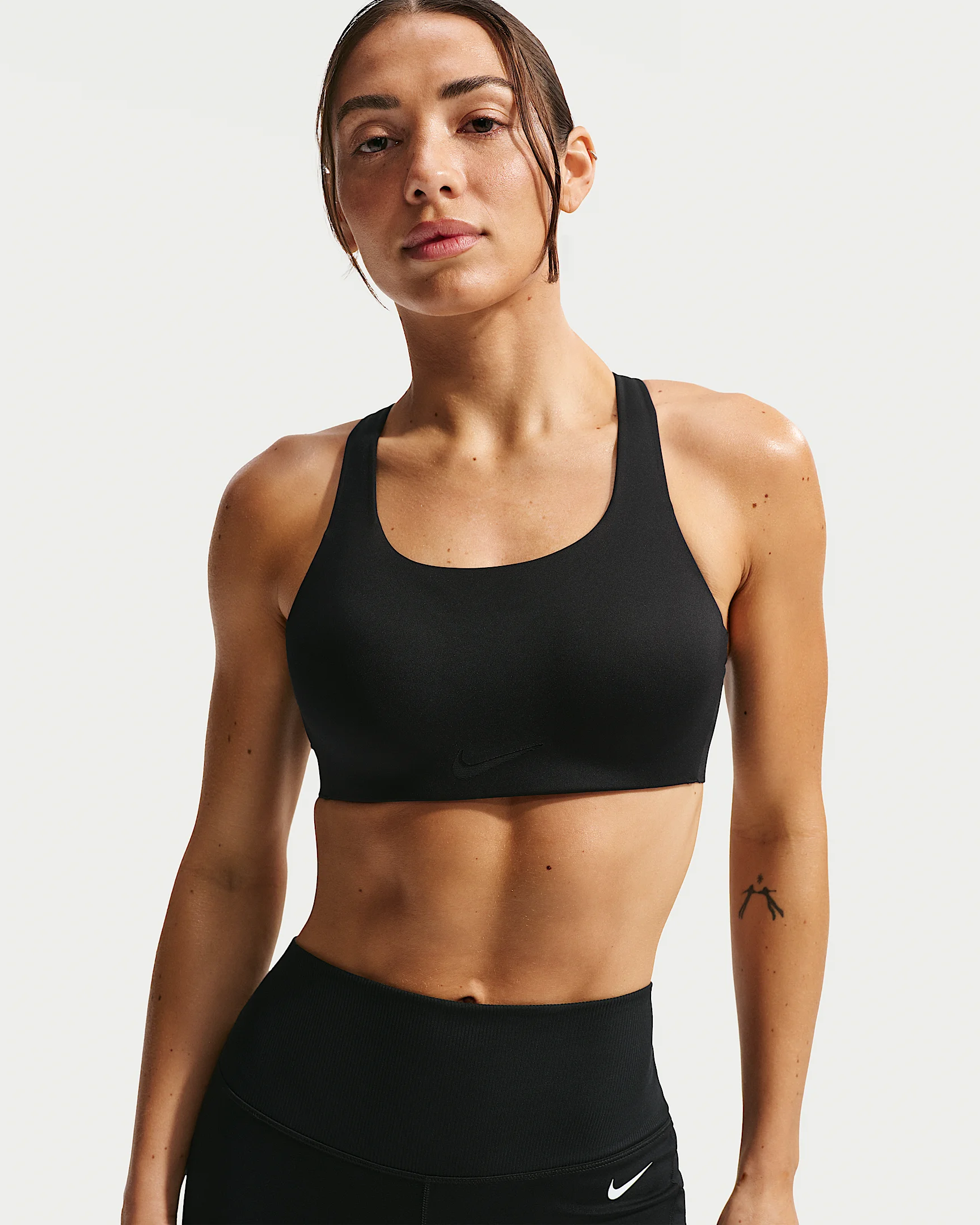 A bra with ultrahigh support that shows up and shows off? Challenge accepted. Molded cups and embedded underwire comfortably hold you in. And for flexible, breathable reinforcement, we added foam padding. The result is the Nike Rival—offering our highest level of support yet for your most intense workouts. More Benefits - Adjustable straps are padded to help prevent digging. - Racerback design allows for unrestricted movement. Product Details - Hook-and-eye closure - Body/Panels lining: 70% polyester/30% spandex. Mesh: 81% polyester/19% spandex. Pad back fabric: 100% polyester. Pad: 100% polyurethane. - Machine wash - Imported - Shown: Black/Particle Beige - Style: FQ7387-010 SIZE & FIT Model is wearing size S Model height: 5'7"170cm Model bust: 32"81cm Tight fit: snug and form-fitting