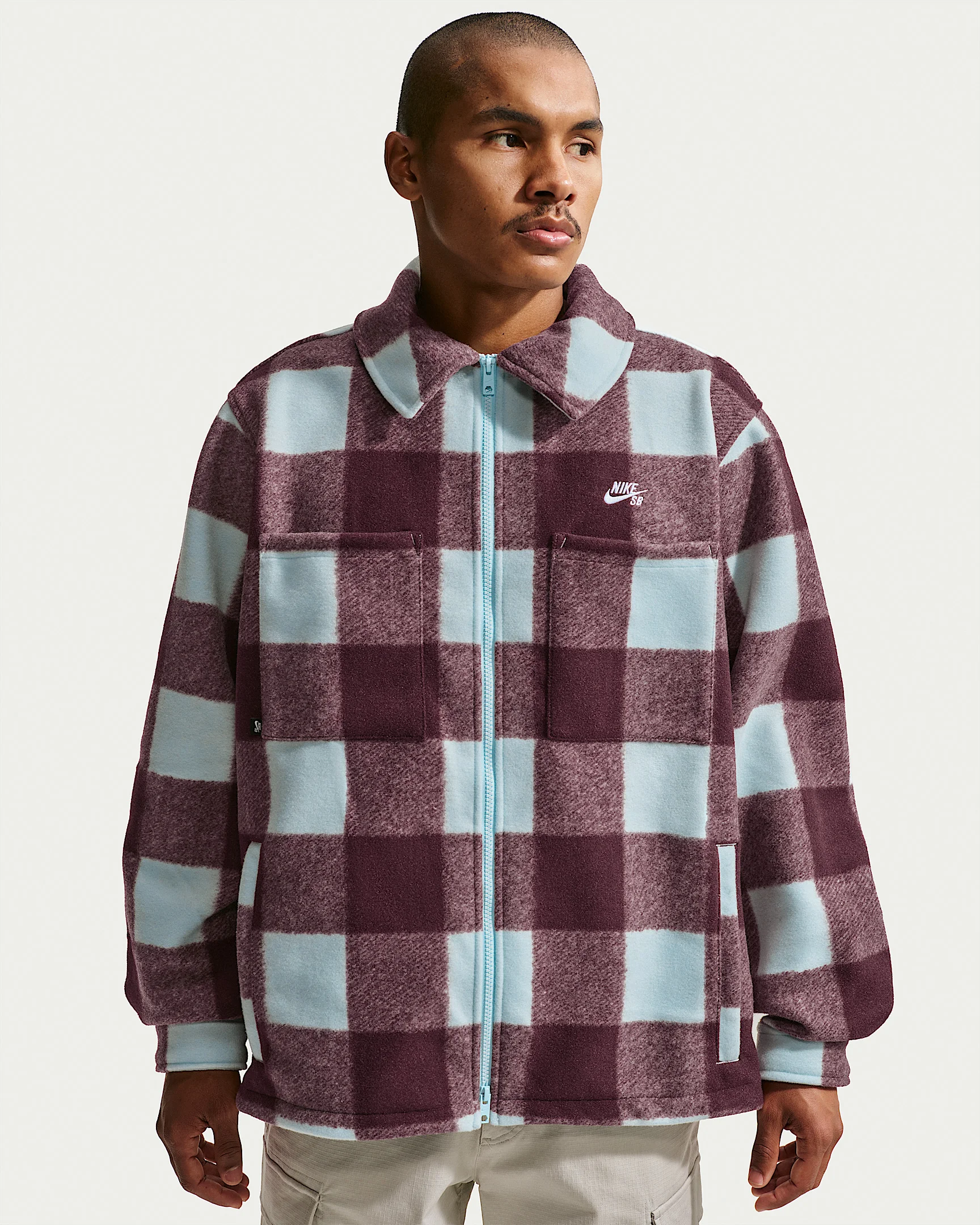Layer up in this midweight shirt jacket. Soft both inside and out, this oversized style has dropped shoulders and extra room through the body for a casual look that moves with you. Product Details - 100% polyester - Embroidered Nike SB logo - 2-way zipper - Internal water repellent storm flap - Machine wash - Imported - Shown: Glacier Blue/Burgundy Crush - Style: HV1421-474 SIZE & FIT Oversized fit: exaggerated and spacious