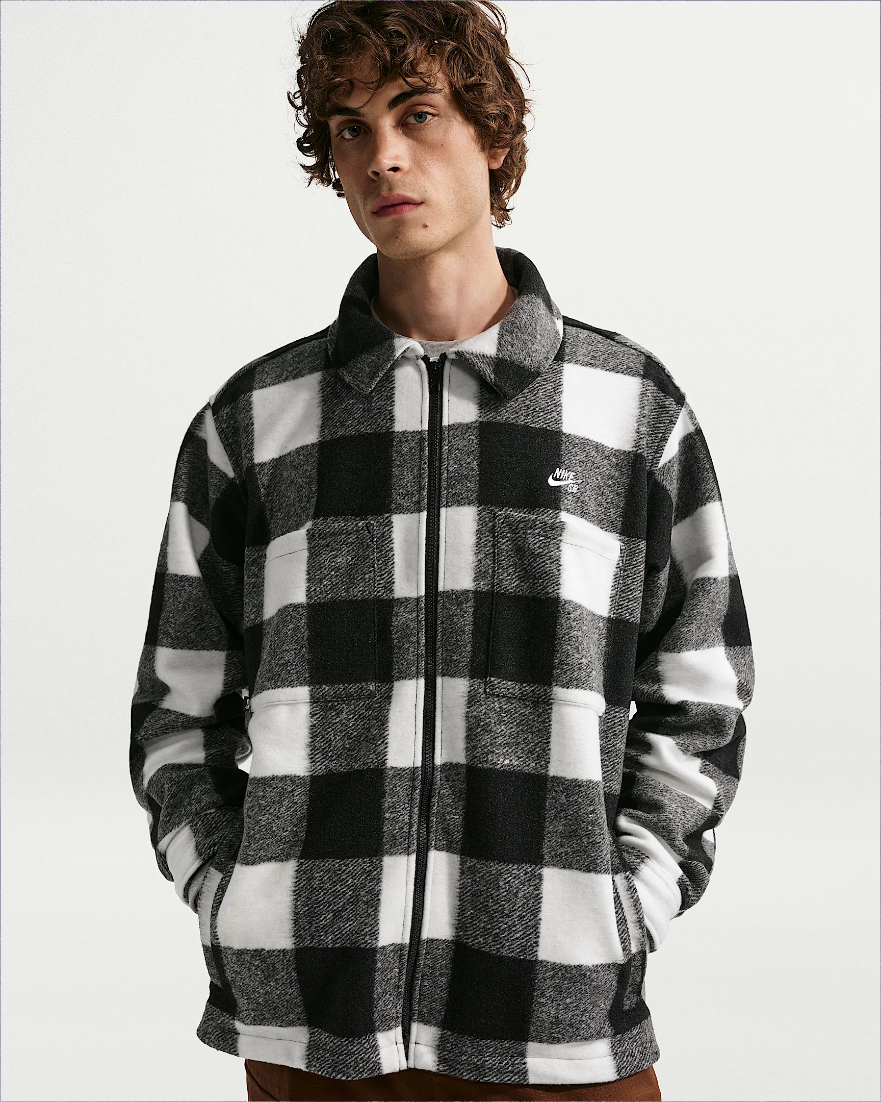 Layer up in this midweight shirt jacket. Soft both inside and out, this oversized style has dropped shoulders and extra room through the body for a casual look that moves with you. Product Details - 100% polyester - Embroidered Nike SB logo - 2-way zipper - Internal water repellent storm flap - Machine wash - Imported - Shown: White/Black/White - Style: HV1421-100 SIZE & FIT Oversized fit: exaggerated and spacious
