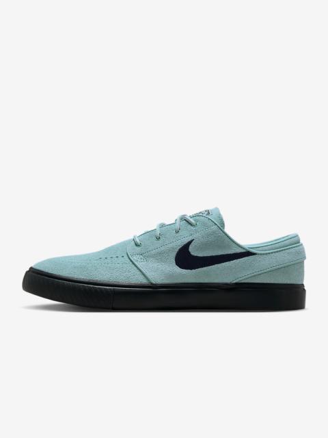 Coming in hot after a year of R&R (research and redesign), the Janoski continues the journey of Stefan's signature skateboarding line. Skate-specific tread helps deliver great boardfeel and flick. A reengineered upper helps give you better fit and comfort, opening the door for next-level performance. Benefits - Suede upper is soft and durable. - Vulcanized construction fuses the sole to the upper for a flexible, broken-in feel. - Snappy and responsive, Zoom Air cushioning helps provide a quick-off-the-ground sensation. Product Details - 2 sets of laces - Shown: Obsidian/Obsidian/Black/Black - Style: FD6757-402