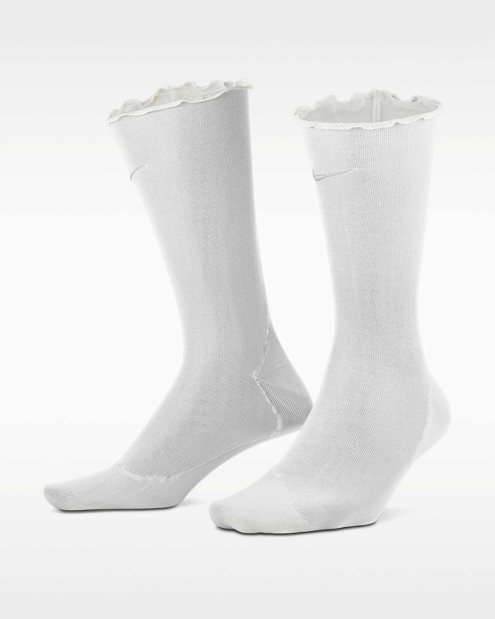 The Nike Sheer Socks combine sheer yarn with sweat-wicking technology for breathable comfort in or out of the gym. Benefits - Sweat-wicking fabric helps keep your feet dry and comfortable. - Sheer yarn feels lightweight and breathable. - Knit-in toe and heel provide durability. Product Details - Frilly edge and hosiery seam on back - 100% nylon - Machine wash - Imported - Shown: Photon Dust/White/Photon Dust - Style: SK0009-025