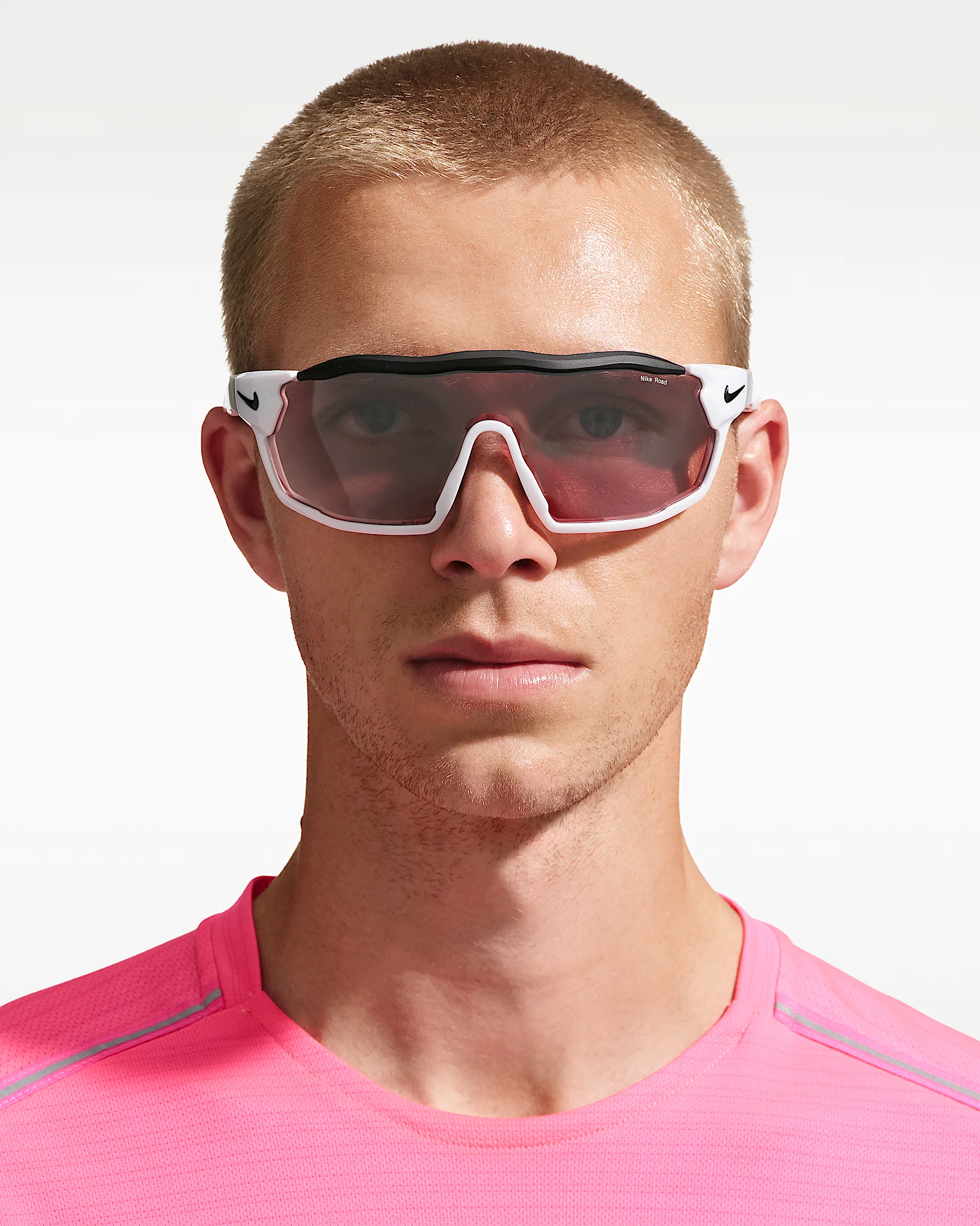 Find the form that optimizes your performance. The Nike Show X Rush Sunglasses feature an interchangeable design that lets you decide how you want to wear them. Snap off the top bar for no-distractions visibility. Easily insert clip-in prescription lens if you need it. Benefits - Frame size: 58mm lens width; 16mm bridge width; 130mm temple length - Nike Road Tint cuts harsh glare and highlights subtle changes in pavement. - Nike Elite 1-piece lens has superior coverage and clarity. - Nike Max Optics Pro reduces light reflection and provides precisie vision with hydro-oleophobic coatings to repel water and oil for a clearer view of what’s ahead. - Adjustable temples with silicone sleeves provide enhanced grip and optimal fit - Floating nose pad enhances airflow and absorbs impact. Product Details - Injected frame material is derived from at least 45% castor bean oil. - Anti-fog ventilation holes. - 100% UVA/UVB protection. - Shown: White - Style: IU4697X-100