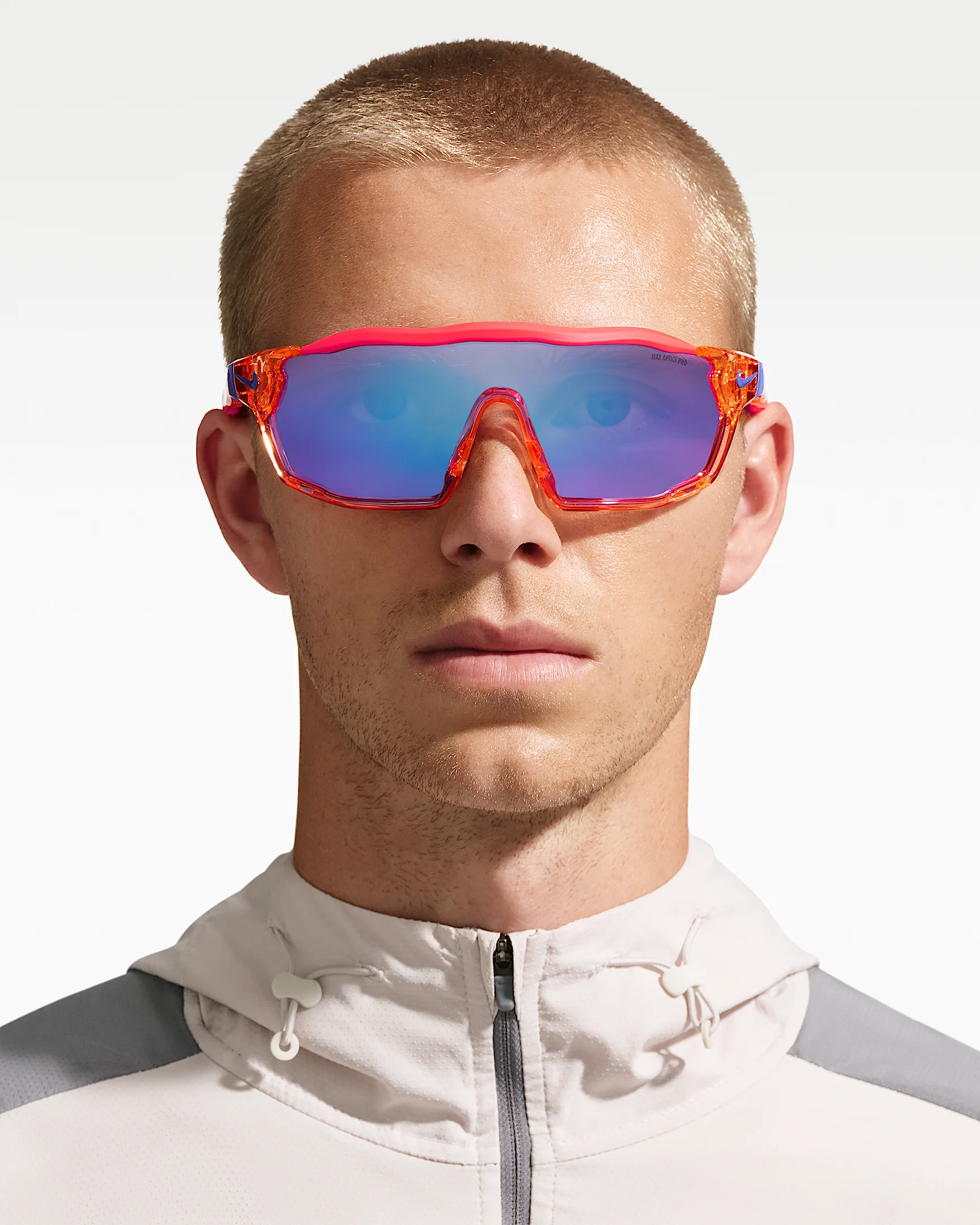 Find the form that optimizes your performance. The Nike Show X Rush Sunglasses feature an interchangeable design that lets you decide how you want to wear them. Snap off the top bar for no-distractions visibility. Easily insert clip-in prescription lens if you need it. Benefits - Frame size: 58mm lens width; 16mm bridge width; 130mm temple length - Nike Road Tint cuts harsh glare and highlights subtle changes in pavement. - Nike Elite 1-piece lens has superior coverage and clarity. - Nike Max Optics Pro reduces light reflection and provides precisie vision with hydro-oleophobic coatings to repel water and oil for a clearer view of what’s ahead. - Adjustable temples with silicone sleeves provide enhanced grip and optimal fit - Floating nose pad enhances airflow and absorbs impact. Product Details - Injected frame material is derived from at least 45% castor bean oil. - Anti-fog ventilation holes. - 100% UVA/UVB protection. - Shown: Crimson/Blue - Style: IU4697X-814