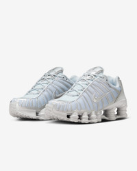 The Nike Shox TL takes mechanical cushioning to the next level. A recrafted version of the 2003 icon, it features breathable mesh in the upper and full-length Nike Shox technology for optimal impact absorption and a bold look on the streets. Benefits - Nike Shox technology combines resilient, flexible columns with moderator plates for outstanding cushioning that compresses and regains its shape. - Combination upper with full TPU cage is near-exact replica of the 2003 Nike Shox TL. - Molded overlays throughout midfoot provide support and snug fit. - TPU plate in heel between midsole and Nike Shox technology helps provide lateral stability and support. Product Details - Foam midsole - Rubber outsole - Shown: Pure Platinum/Smoke Grey/Metallic Silver - Style: IO1912-043