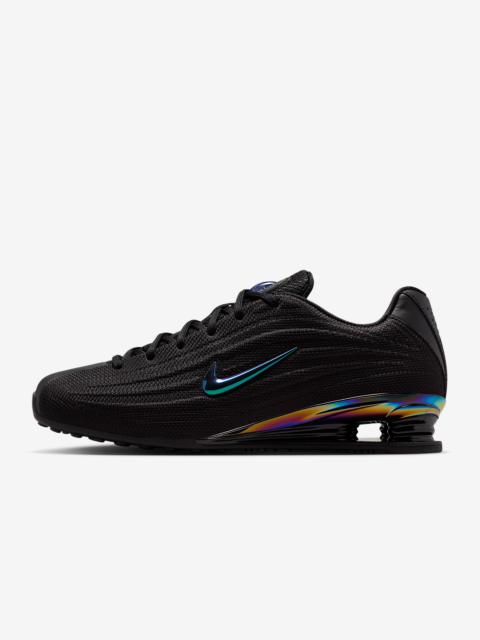 Sleek, low-profile and femme: Your favorite retro runner has reached its next evolution. The Shox Z's slim, stitchless upper sits atop a fresh take on the iconic column design for a look that blends sporty and the sartorial. Bold details, like the vibrant Nike Swoosh and metallic accents, complement the all-black aesthetic. Benefits - Originally designed to support the stride of runners, Nike Shox columns provide responsive cushioning. - Modified, circular waffle outsole gives traction. Product Details - Shown: Phantom/Metallic Silver/Multi-Color - Style: IM6051-002