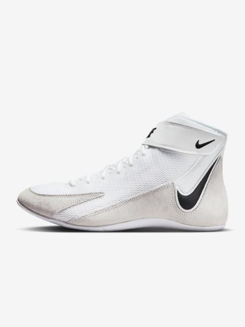 When the opportunity presents itself, make your move in the Nike Speedsweep 8. Its breathability and support are built to give you confidence long into the third period. The above-the-ankle collar helps form to your foot, while the one-piece outsole helps you move freely. Benefits - Open-hole mesh adds breathability. - Suede provides support. - Adjustable strap helps secure your foot. - Rubber outsole gives you traction for quick moves on the mat. - This model comes with traditional laces, but you can hide them beneath the ankle strap. Product Details - Shown: Black/Black/Wolf Grey/White - Style: HF9132-001