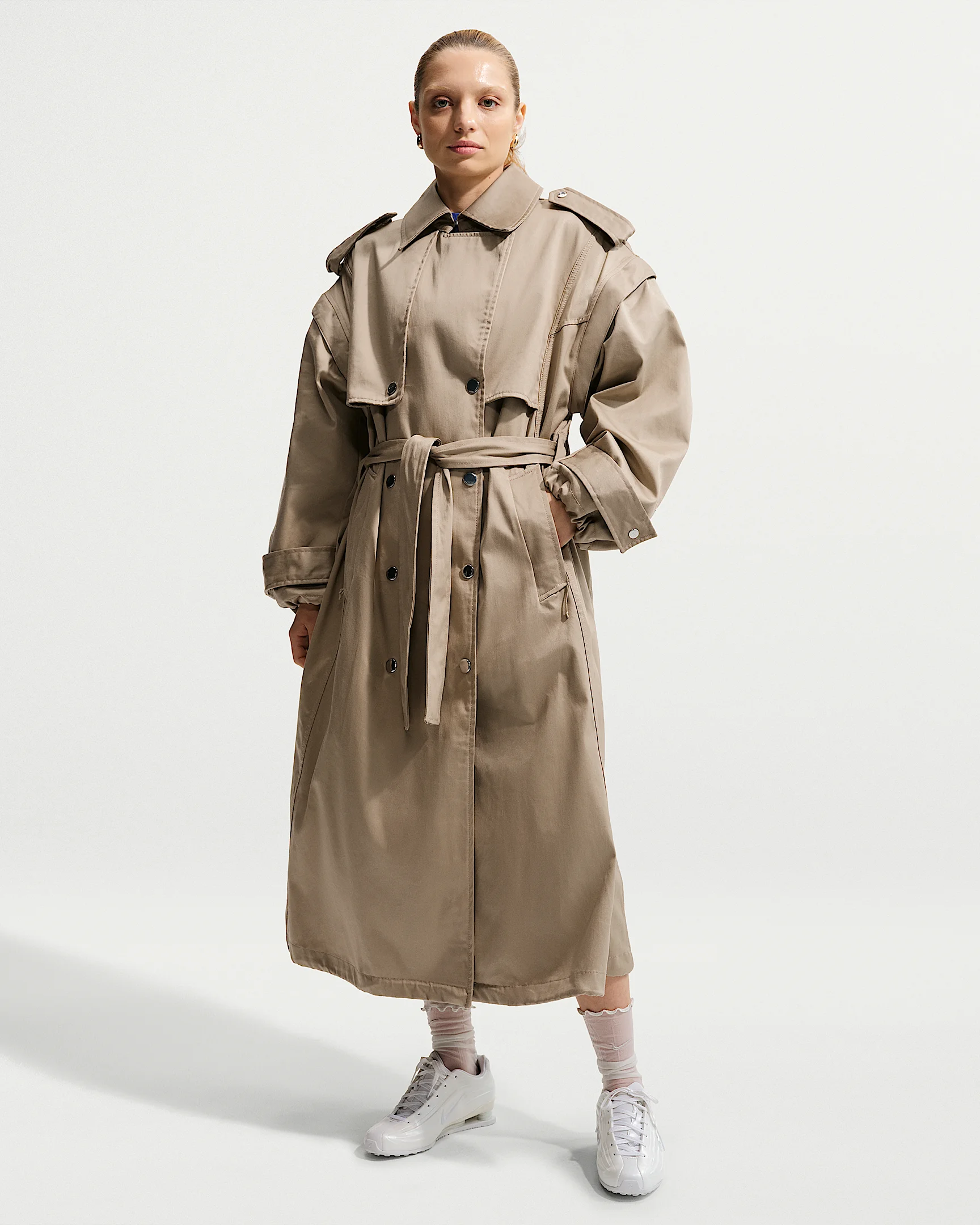 Refined construction, liquid-like detailing, all rooted in Nike's intricate DNA. We're keeping things Airreverent with This oversized, water-repellent trench coat. It's designed with a double breast, epaulet shoulders and removable sleeves. Bungees in the bottom hem and sleeves, along with bottom zippered back vent, let you hone in on the perfect look. Product Details - 100% cotton; Panels Lining: 100% polyester - Machine wash - Imported - Shown: Khaki/Khaki/Khaki - Style: II3949-247 SIZE & FIT Model is wearing size S and is 5′10″178cm Oversized fit: exaggerated and spacious