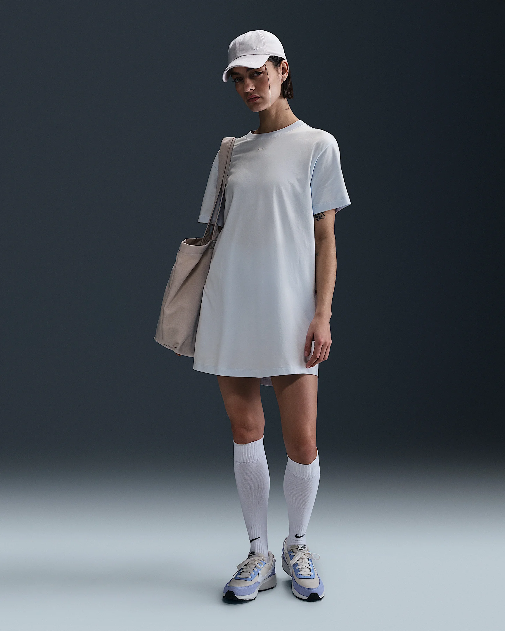 As comfy and easy to throw on as your favorite tee, this dress is ready for whatever you are. A curved hem and a flowy, oversized fit add a chic twist to a closet staple. Benefits - Dropped shoulders and oversized fit provide comfortable, confident feel. - Nothing says classic T-shirt like 100% soft cotton. Product Details - 100% cotton - Ribbed neckline - Embroidered Swoosh logo - Machine wash - Imported - Shown: Blue Tint/Sail - Style: DV7882-423 SIZE & FIT Model is wearing size S and is 5′10″178cm Oversized fit: exaggerated and spacious