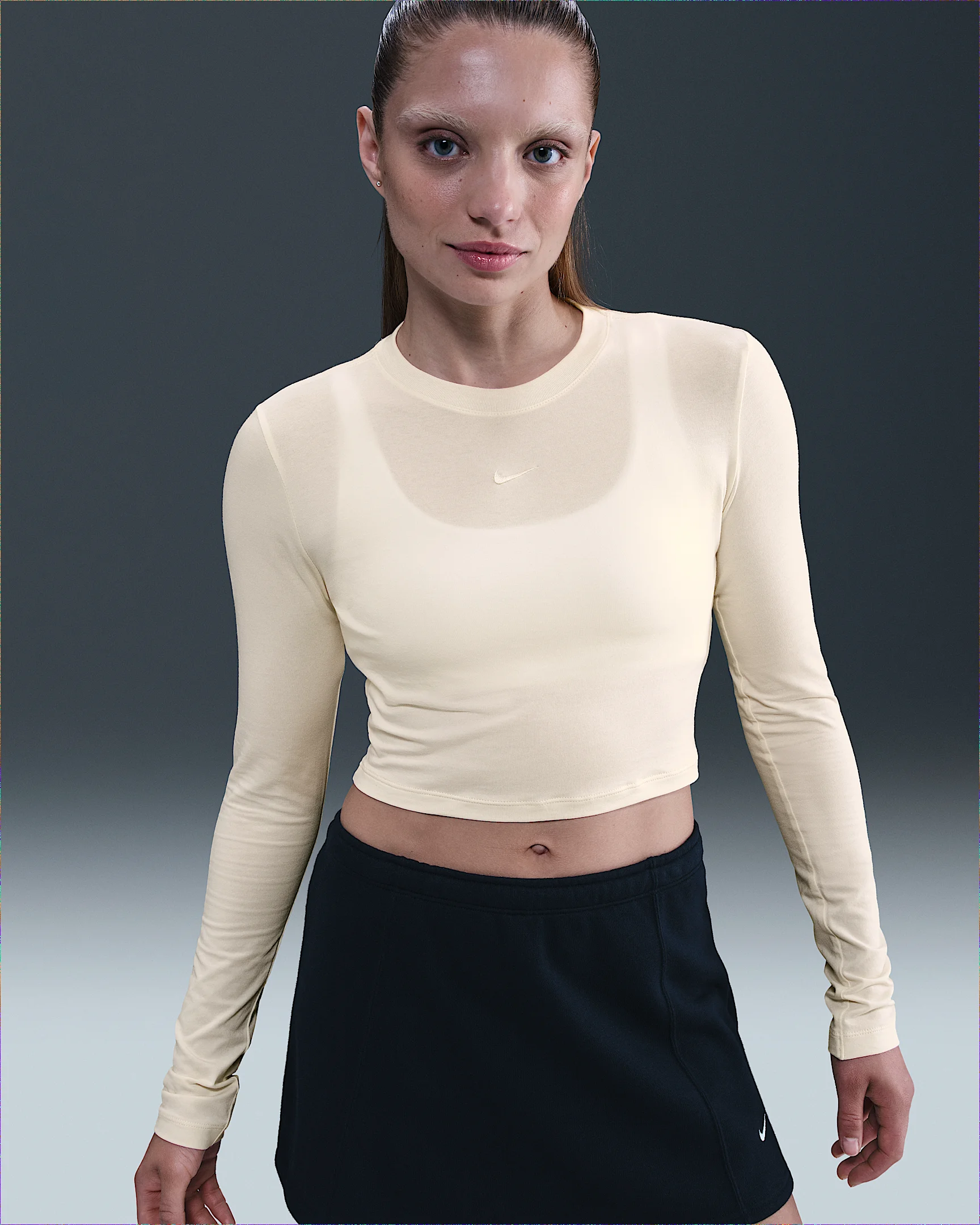 Slightly cropped and snug, this top is ready for you to style it your way. Our smooth jersey is stretchy with a slight drape, making it perfect for everyday wear. Product Details - 48% modal/46% cotton/6% spandex - Embroidered Swoosh logo - Machine wash - Imported - Shown: Pale Ivory - Style: HF5322-110 SIZE & FIT Model is wearing size S and is 5′10″178cm Sm fit: sleek and tailored
