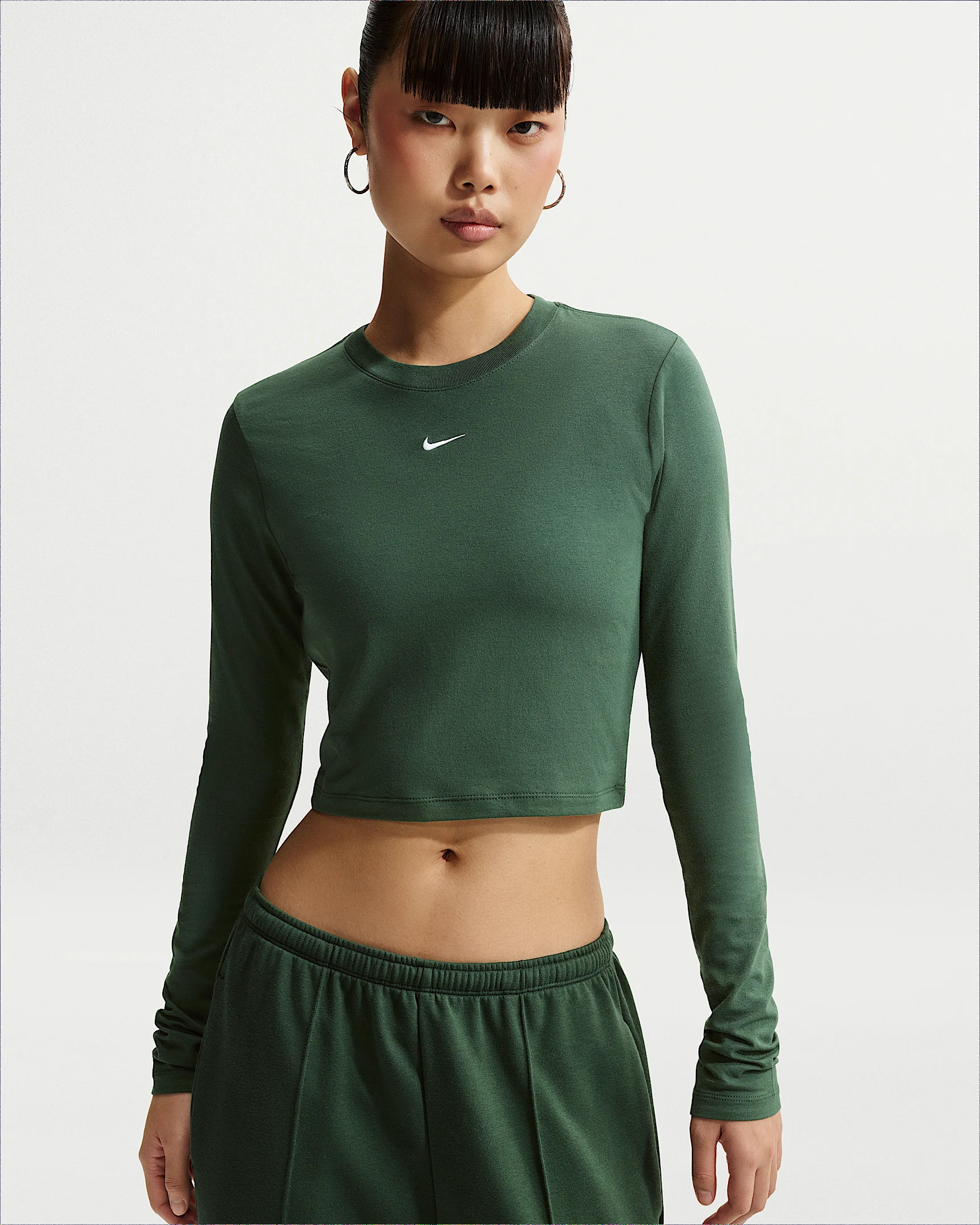 Slightly cropped and snug, this top is ready for you to style it your way. Our smooth jersey is stretchy with a slight drape, making it perfect for everyday wear. Product Details - 48% modal/46% cotton/6% spandex - Embroidered Swoosh logo - Machine wash - Imported - Shown: Fir/White - Style: HF5322-326 SIZE & FIT Model is wearing size S and is 5′11″180cm Sm fit: sleek and tailored