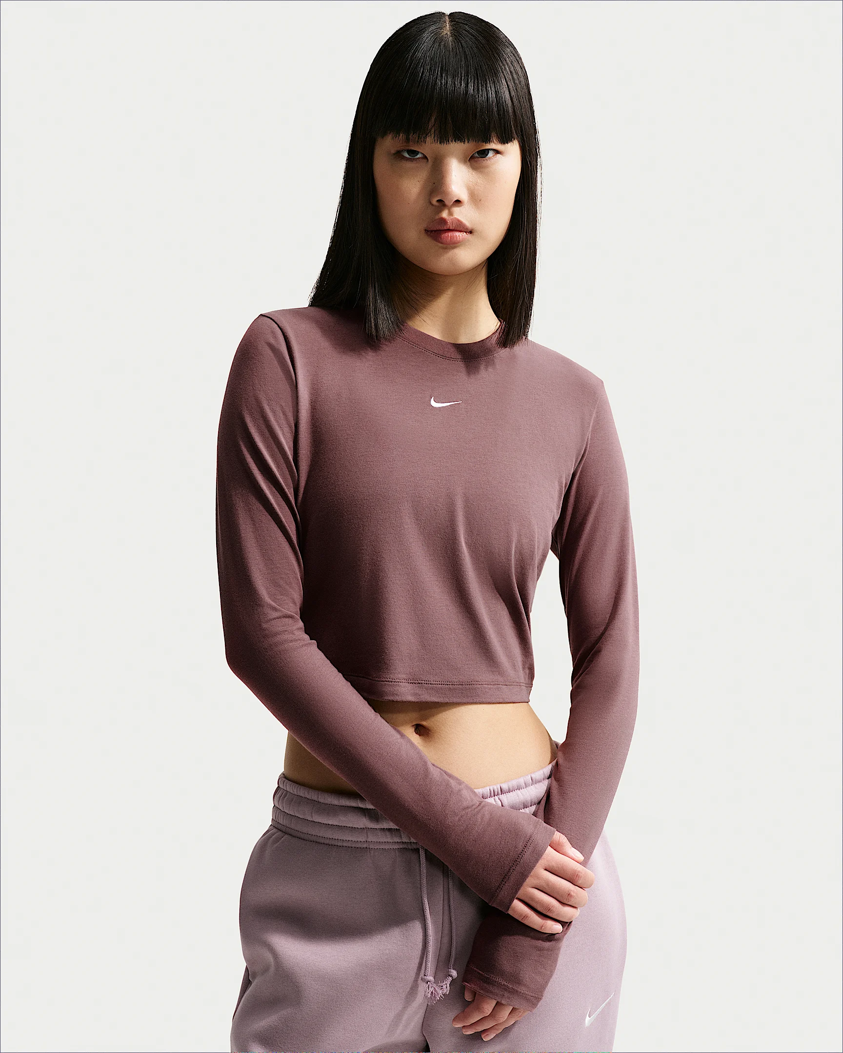 Slightly cropped and snug, this top is ready for you to style it your way. Our smooth jersey is stretchy with a slight drape, making it perfect for everyday wear. Product Details - 48% modal/46% cotton/6% spandex - Embroidered Swoosh logo - Machine wash - Imported - Shown: Tattoo/White - Style: HF5322-503 SIZE & FIT Model is wearing size S and is 5'11"180cm Sm fit: sleek and tailored