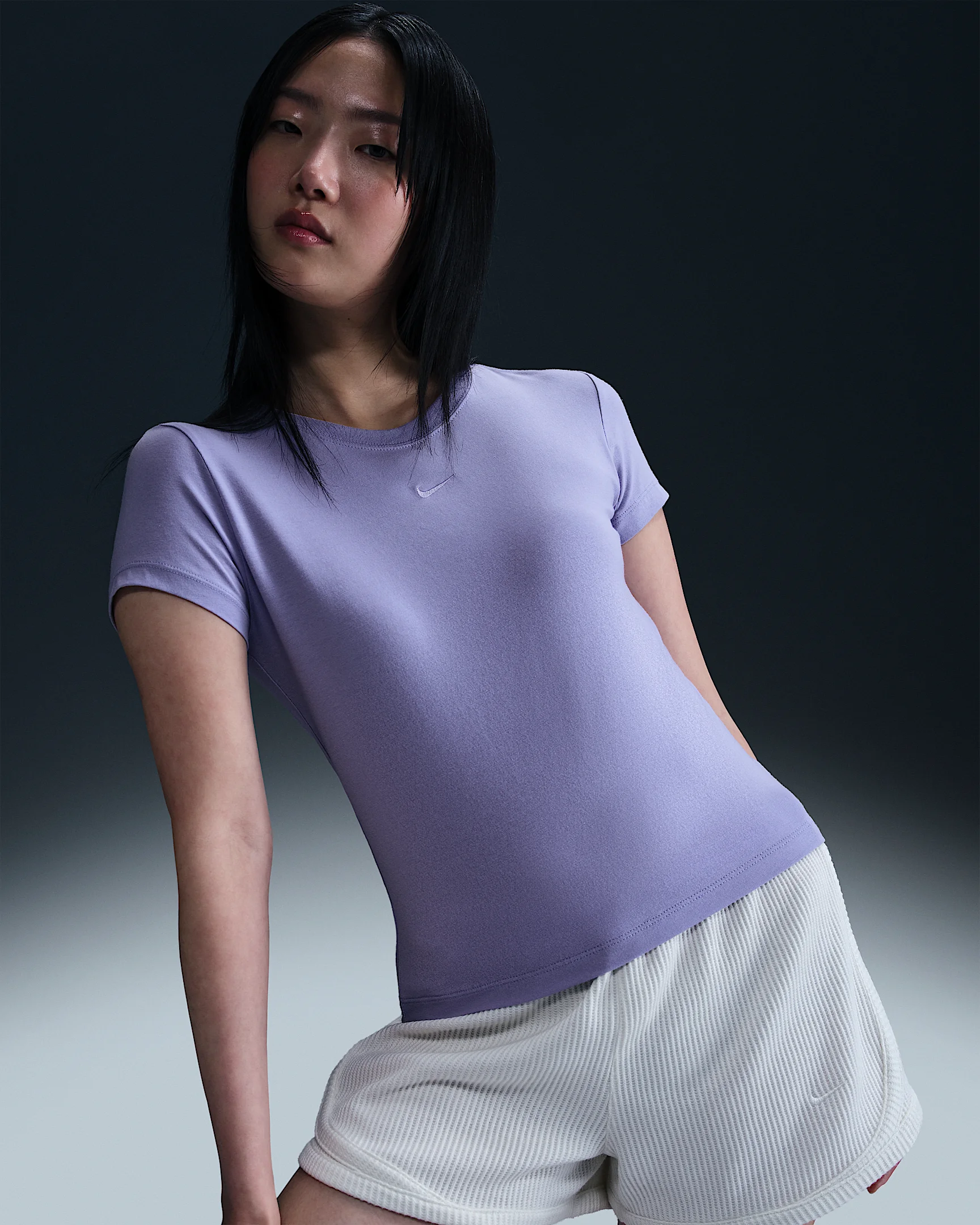 Perfect for any day, this slightly cropped, slim-fitting tee is classic and versatile. Our smooth jersey feels stretchy with a slight drape, giving it a comfortable, body-skimming feel. Product Details - 48% modal/46% cotton/6% spandex - Machine wash - Imported - Shown: Lilac Ice - Style: FV5508-533 SIZE & FIT Model is wearing size S and is 5′9″175cm Sm fit: sleek and tailored Fits small; we recommend ordering a size up
