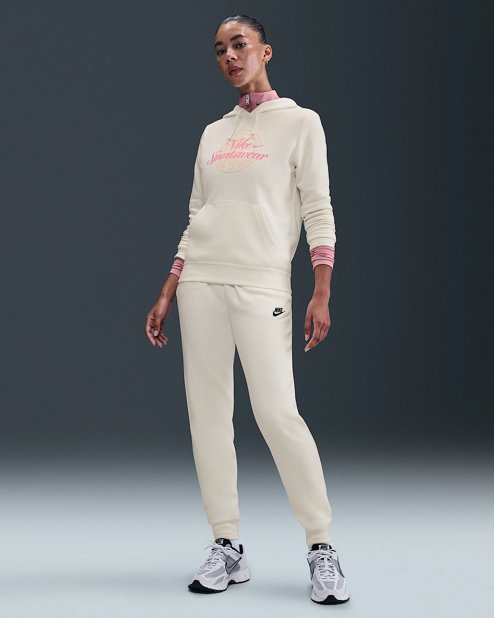 Club Fleece, universally loved for its coziness and consistency, is for everyone. These mid-rise Club Fleece pants have a soft, familiar feel that makes it easy to stay warm and comfortable. Benefits - Our best-selling fleece for a reason, Club Fleece has a cozy, familiar feel and consistent fit you can return to again and again. Brushed for added warmth and softness, it’s an ideal layer for colder temperatures. - Soft and stretchy, the ribbed cuffs help show off your shoes. - Pockets provide quick storage for keys, phone and cold hands. Product Details - 80% cotton/20% polyester - Flat drawcord and elastic waist - Embroidered Futura logo - Machine wash - Imported - Shown: Sail/Black - Style: DQ5191-133 SIZE & FIT Model is wearing size S and is 5′9″175cm Standard fit: easy and traditional Fl length: hits below ankle