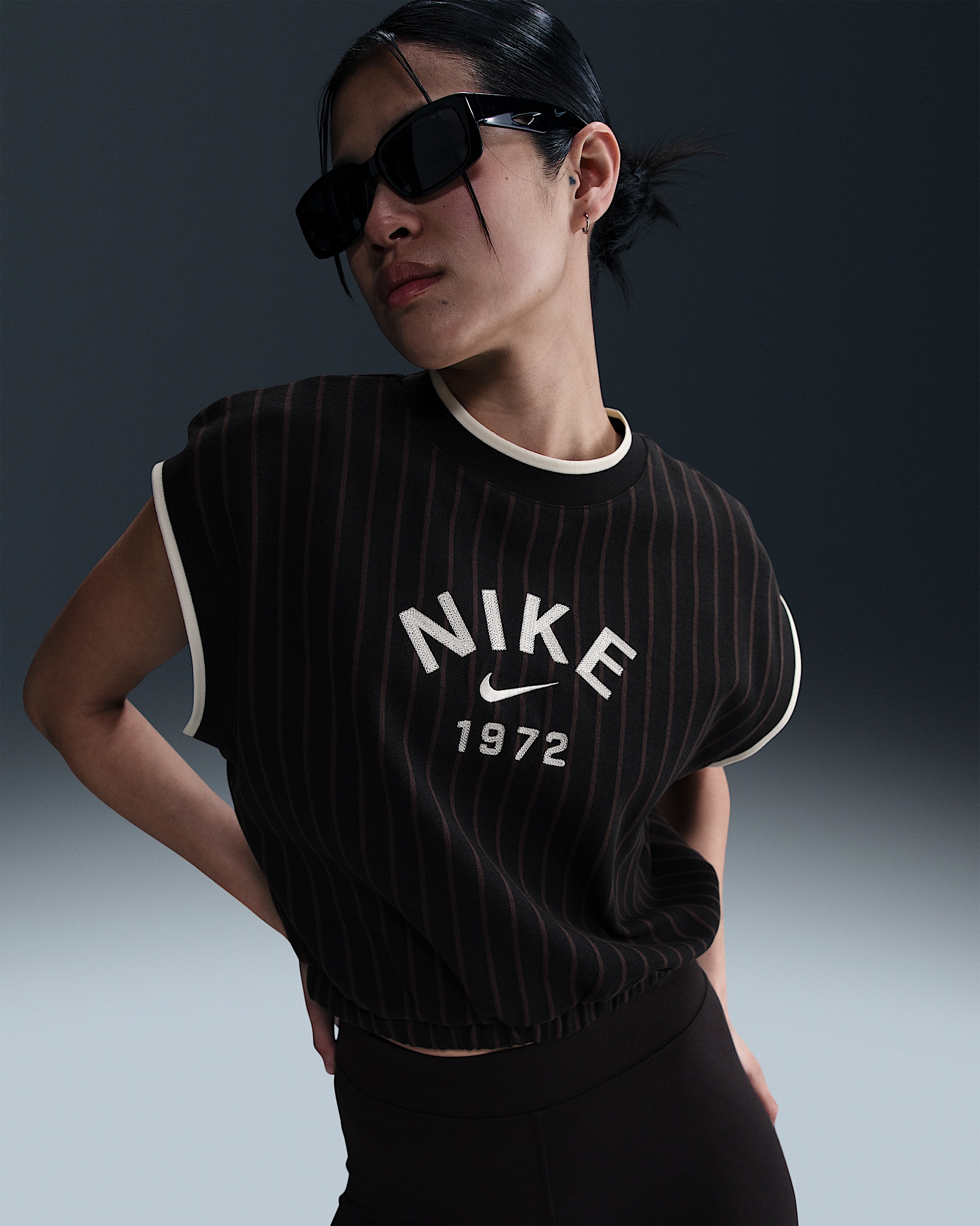 This striped tank has a loose fit that cinches at your waist for a look rooted in vintage track style. Product Details - 94% cotton/6% spandex - Ribbing at collar and sleeves - Embroidered graphics on chest - Swoosh logo flag label - Machine wash - Imported - Shown: Black/Velvet Brown/Sail/Sail - Style: HV2092-010 SIZE & FIT Model is wearing size S and is 5′10″178cm Loose fit: roomy and relaxed