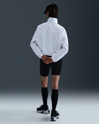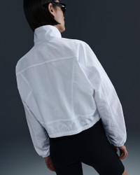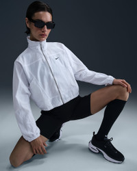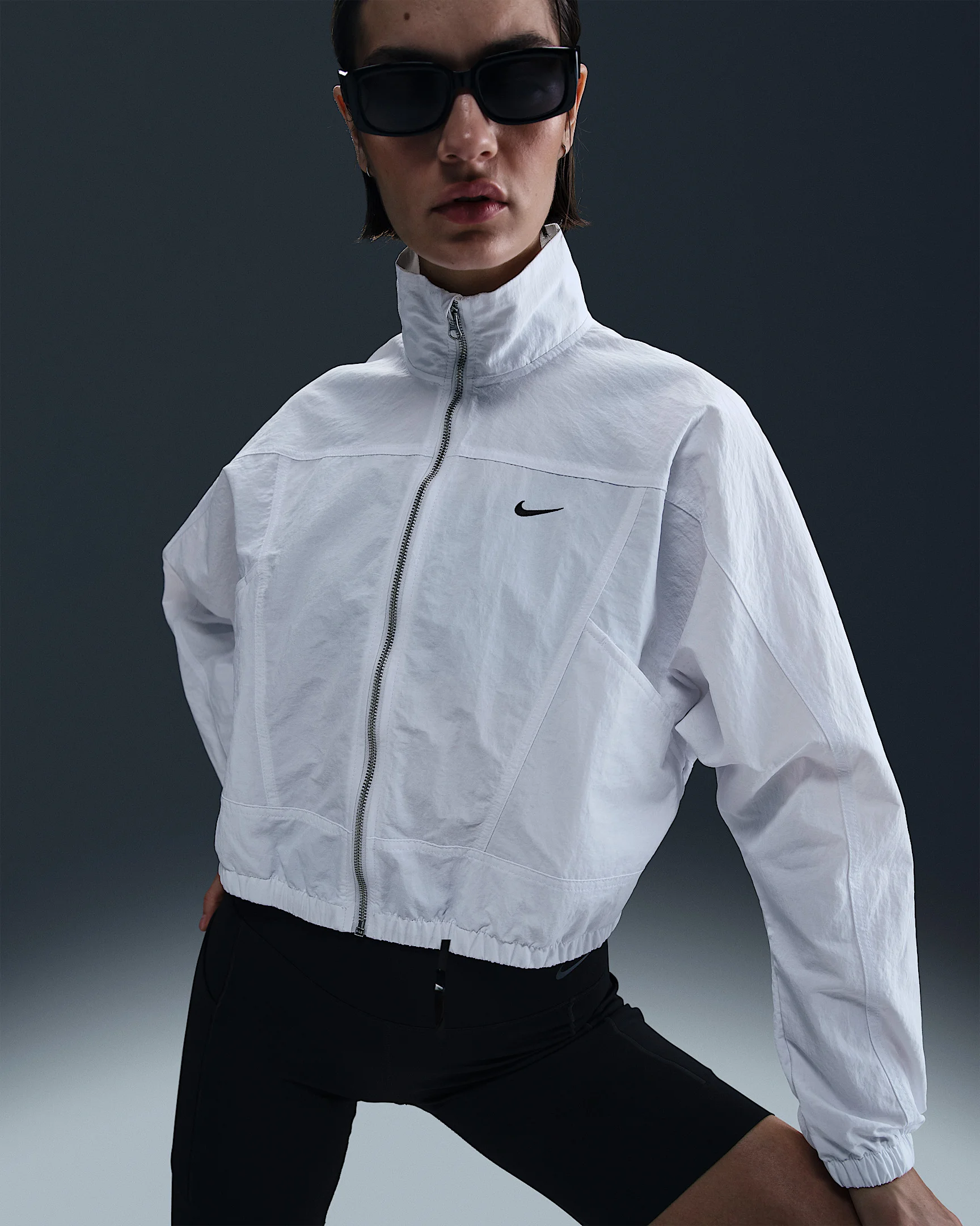 Simplicity and functionality come together in this lightweight jacket. Textured, water-repellent nylon and an elongated collar help keep you covered come rain or shine. Angled seams and a cropped length add dimension to the oversized fit. Benefits - Water-repellent finish helps keep you dry in wet weather. - Oversized fit makes layering easy. Product Details - 100% nylon - This product provides UVA and UVB protection from the sun only in the areas covered by the garment. To protect exposed areas, the use of good quality sunscreen is recommended. - Silver metal zipper - Side-seam pockets - Elastic at cuffs and hem - Embroidered Swoosh logo on left chest - Machine wash - Imported - Shown: White/Black - Style: HJ0999-100 SIZE & FIT Model is wearing size S and is 5′10″178cm Oversized fit: exaggerated and spacious