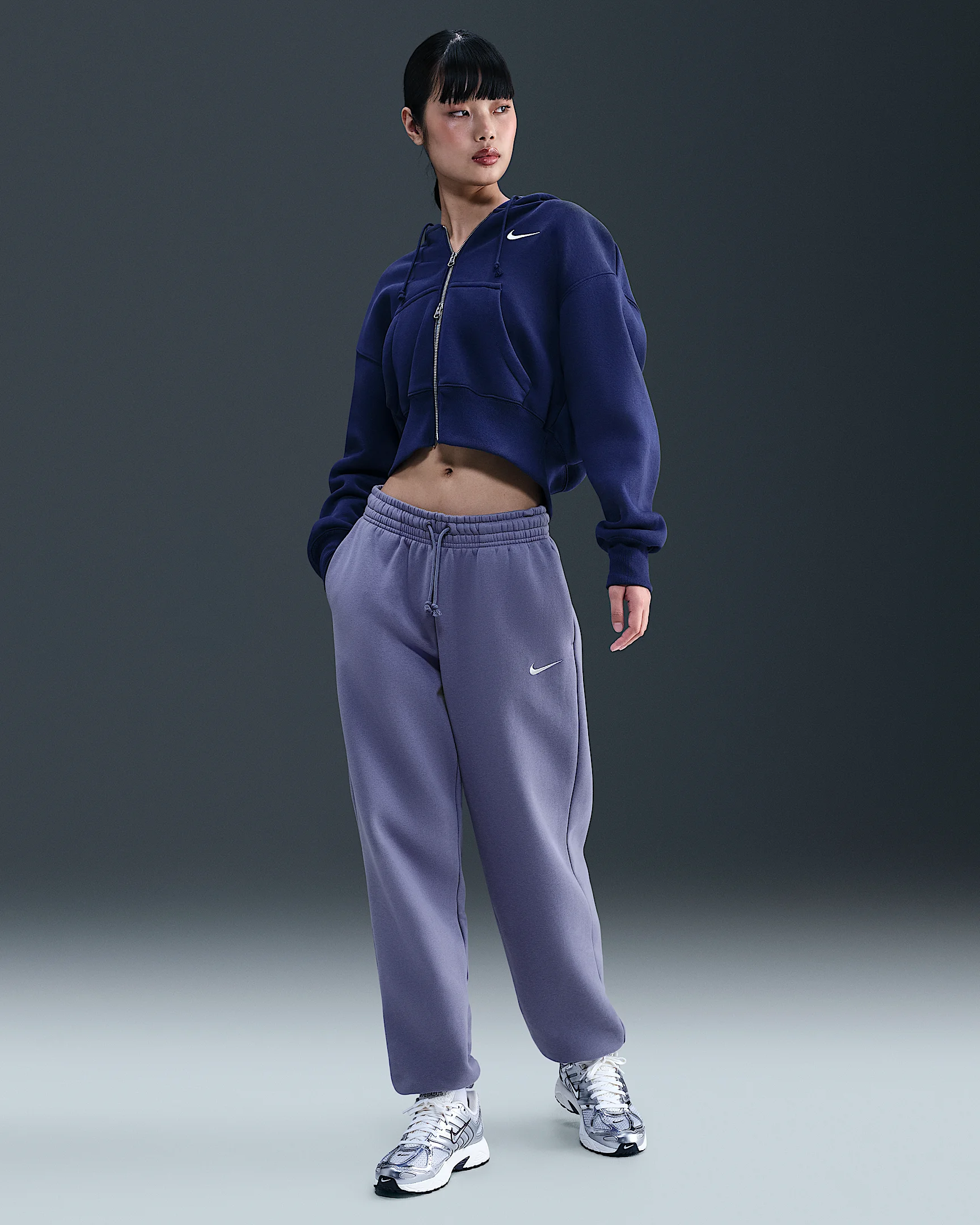 Grounded in style, comfort and versatility, meet our take on luxury loungewear. Whether you're running errands or rewatching your favorite show, these midweight fleece sweats feel extra soft on the inside to help keep you cozy. The oversized fit is intended to sit high on your hips for comfort and a stay-put feel. Benefits - Encased elastic waistband and drawstrings ensure a fit that feels just right. - Pockets provide quick storage for keys, phone and cold hands. Product Details - 80% cotton/20% polyester - Embroidered Swoosh logo on left leg - Machine wash - Imported - Shown: World Indigo/Sail - Style: FZ5996-499 SIZE & FIT Model is wearing size S and is 5′11″180cm Oversized fit: exaggerated and spacious Fl length: hits below ankle