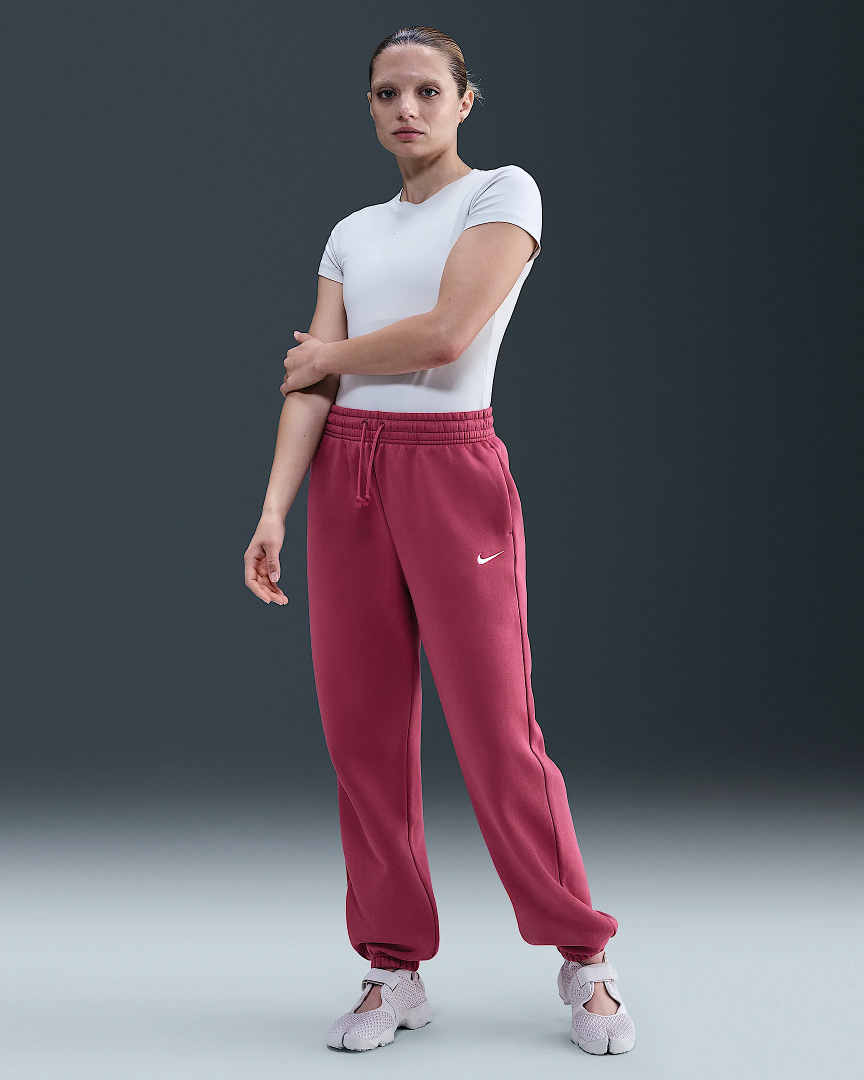 Grounded in style, comfort and versatility, meet our take on luxury loungewear. Whether you're running errands or rewatching your favorite show, these midweight fleece sweats feel extra soft on the inside to help keep you cozy. The oversized fit is intended to sit high on your hips for comfort and a stay-put feel. Benefits - Encased elastic waistband and drawstrings ensure a fit that feels just right. - Pockets provide quick storage for keys, phone and cold hands. Product Details - 80% cotton/20% polyester - Embroidered Swoosh logo on left leg - Machine wash - Imported - Shown: Sweet Beet/Sail - Style: FZ5996-635 SIZE & FIT Oversized fit: exaggerated and spacious Fl length: hits below ankle