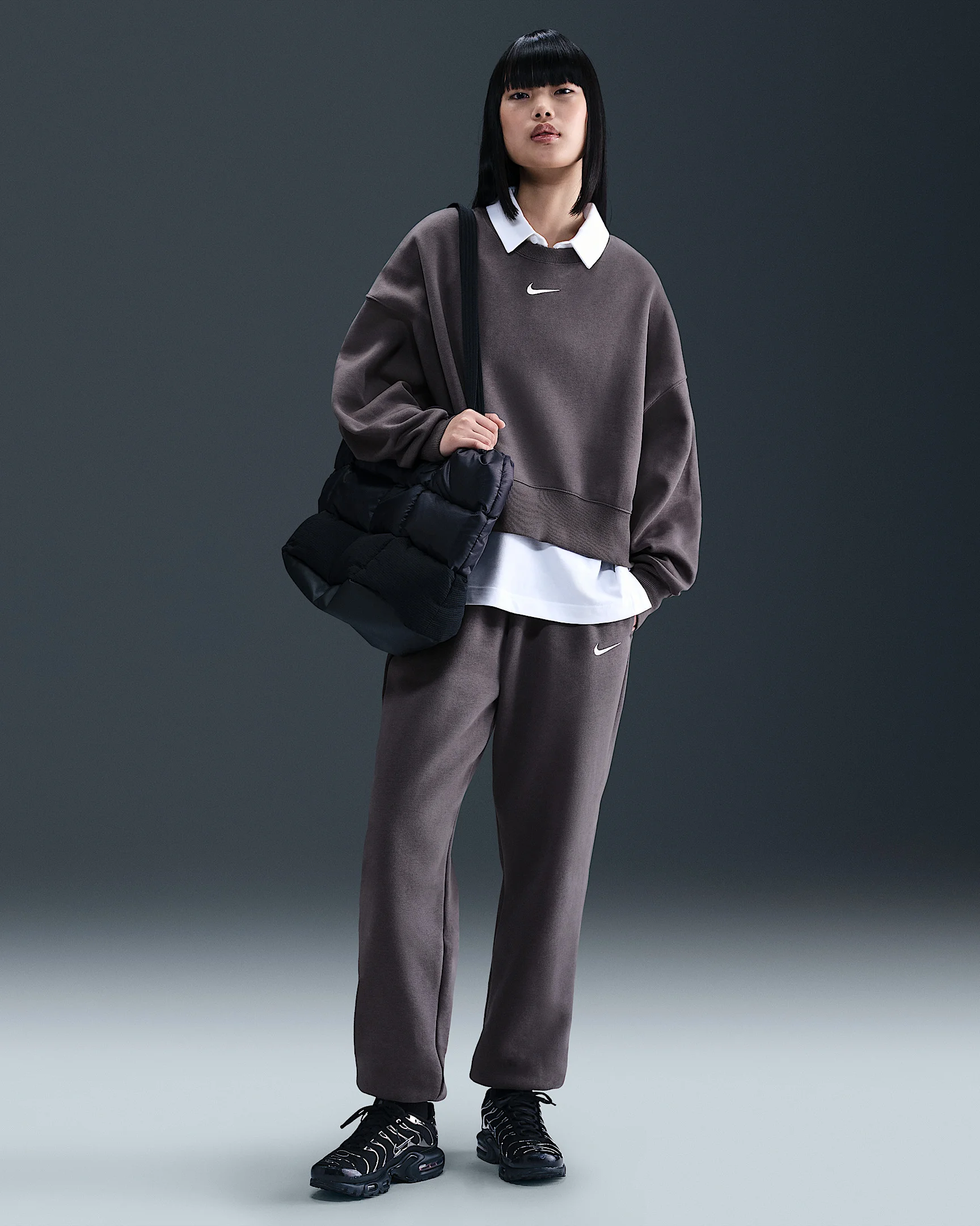 Grounded in style, comfort and versatility, meet our take on luxury loungewear. Whether you're running errands or rewatching your favorite show, these midweight fleece sweats feel extra soft on the inside to help keep you cozy. The oversized fit is intended to sit high on your hips for comfort and a stay-put feel. Benefits - Encased elastic waistband and drawstrings ensure a fit that feels just right. - Pockets provide quick storage for keys, phone and cold hands. Product Details - 80% cotton/20% polyester - Embroidered Swoosh logo on left leg - Machine wash - Imported - Shown: Thunder Grey/Sail - Style: FZ5996-036 SIZE & FIT Model is wearing size S and is 5′11″180cm Oversized fit: exaggerated and spacious Fl length: hits below ankle