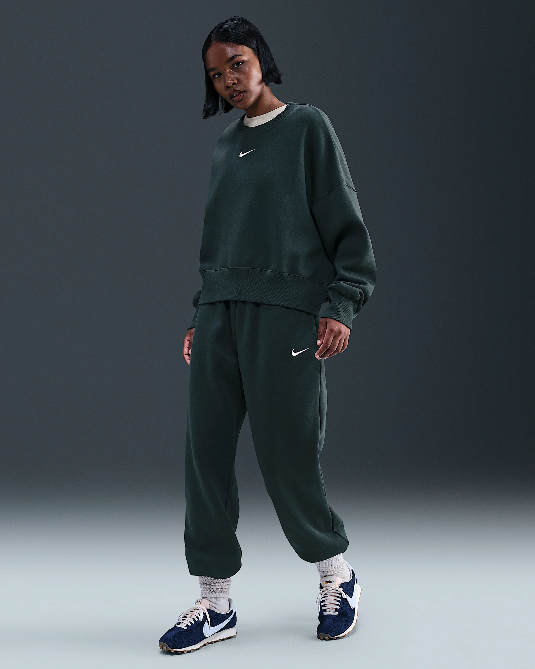 Grounded in style, comfort and versatility, meet our take on luxury loungewear. Whether you're running errands or rewatching your favorite show, these midweight fleece sweats feel extra soft on the inside to help keep you cozy. The oversized fit is intended to sit high on your hips for comfort and a stay-put feel. Benefits - Encased elastic waistband and drawstrings ensure a fit that feels just right. - Pockets provide quick storage for keys, phone and cold hands. Product Details - 80% cotton/20% polyester - Embroidered Swoosh logo on left leg - Machine wash - Imported - Shown: Seaweed/Sail - Style: FZ5996-391 SIZE & FIT Model is wearing size S and is 5′7″170cm Oversized fit: exaggerated and spacious Fl length: hits below ankle