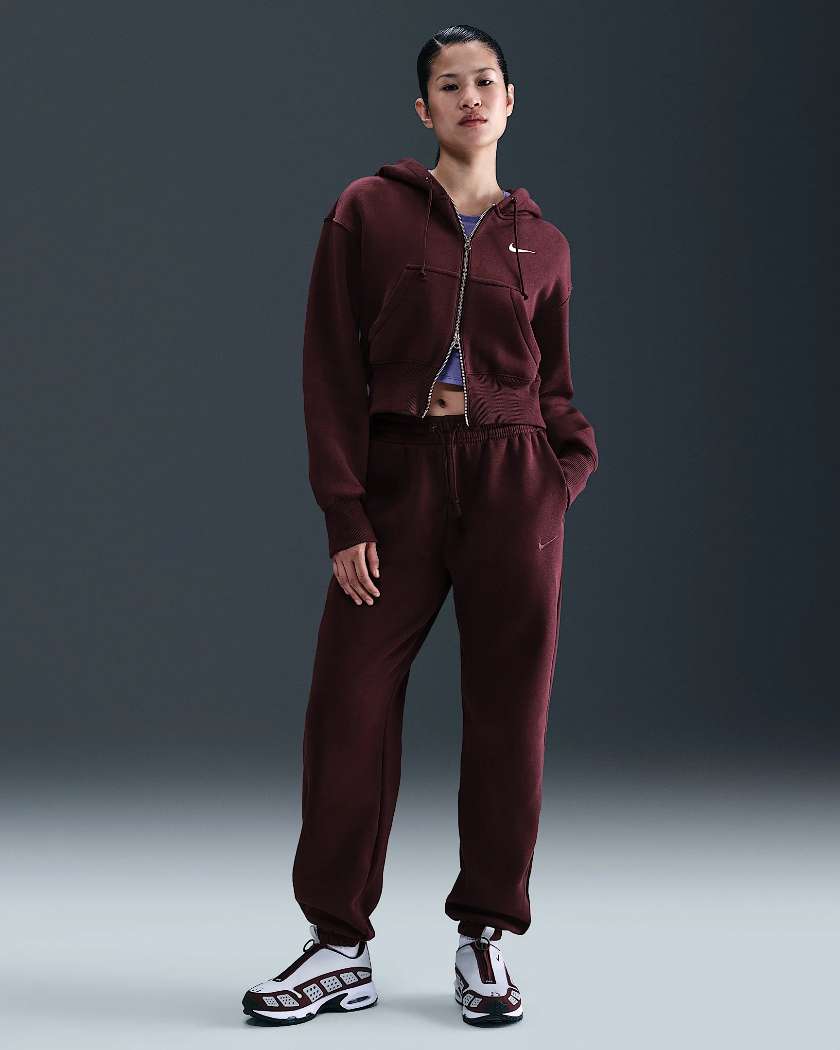 Grounded in style, comfort and versatility, meet our take on luxury loungewear. Whether you're running errands or rewatching your favorite show, these midweight fleece sweats feel extra soft on the inside to help keep you cozy. The oversized fit is intended to sit high on your hips for comfort and a stay-put feel. Benefits - Encased elastic waistband and drawstrings ensure a fit that feels just right. - Pockets provide quick storage for keys, phone and cold hands. Product Details - 80% cotton/20% polyester - Embroidered Swoosh logo on left leg - Machine wash - Imported - Shown: Burgundy Crush/Burgundy Crush - Style: FZ5996-652 SIZE & FIT Model is wearing size S and is 5′10″178cm Oversized fit: exaggerated and spacious Fl length: hits below ankle