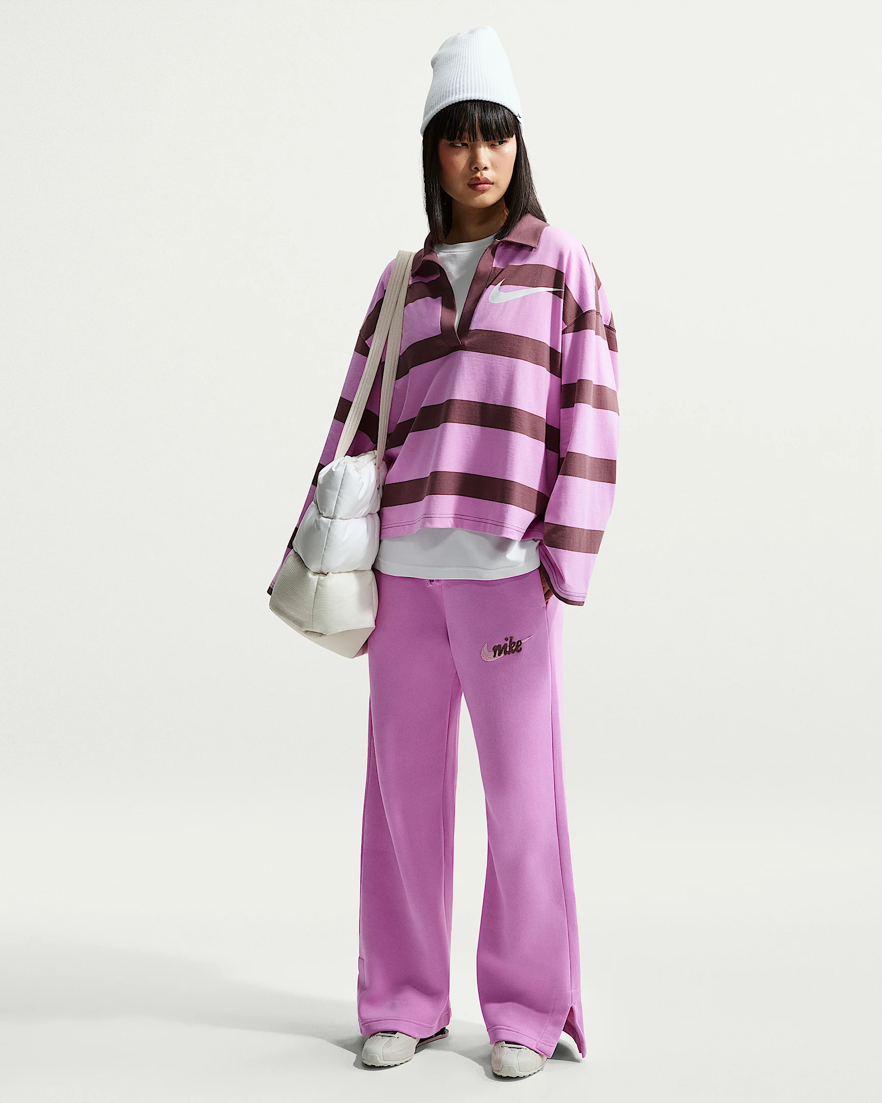 These wide-leg pants are crafted with midweight brushed fleece that's extra soft on the inside and smooth on the outside. They have a high-waisted, relaxed fit and are elevated with a textured logo for a look that's perfectly slouchy yet put-together. Product Details - Elastic waistband with drawcord - Hand pockets - 80% cotton/20% polyester. - Machine wash - Imported - Shown: Light Magenta/Pink Foam - Style: IM9836-503 SIZE & FIT Model is wearing size M and is 5'11"180cm Standard fit: easy and traditional Fl length: hits below ankle