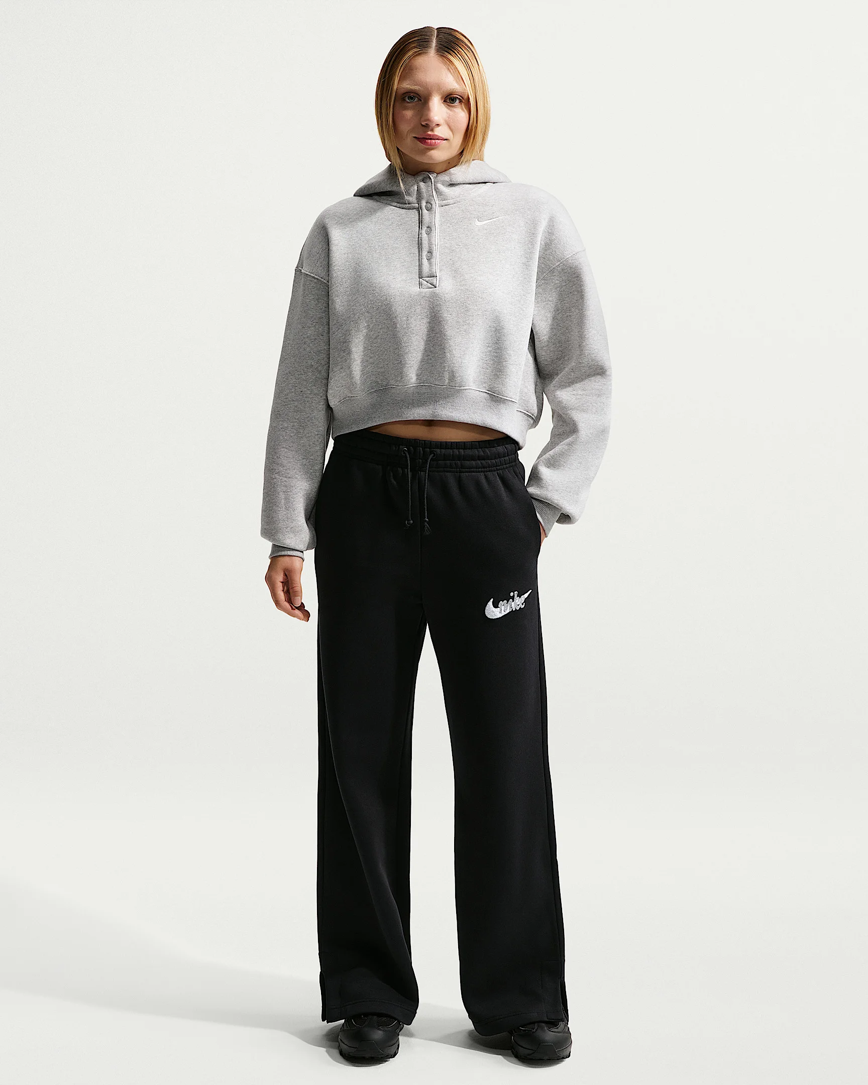 These wide-leg pants are crafted with midweight brushed fleece that's extra soft on the inside and smooth on the outside. They have a high-waisted, relaxed fit and are elevated with a textured logo for a look that's perfectly slouchy yet put-together. Product Details - Elastic waistband with drawcord - Hand pockets - 80% cotton/20% polyester. - Machine wash - Imported - Shown: Black/Summit White - Style: IM9836-010 SIZE & FIT Standard fit: easy and traditional Fl length: hits below ankle