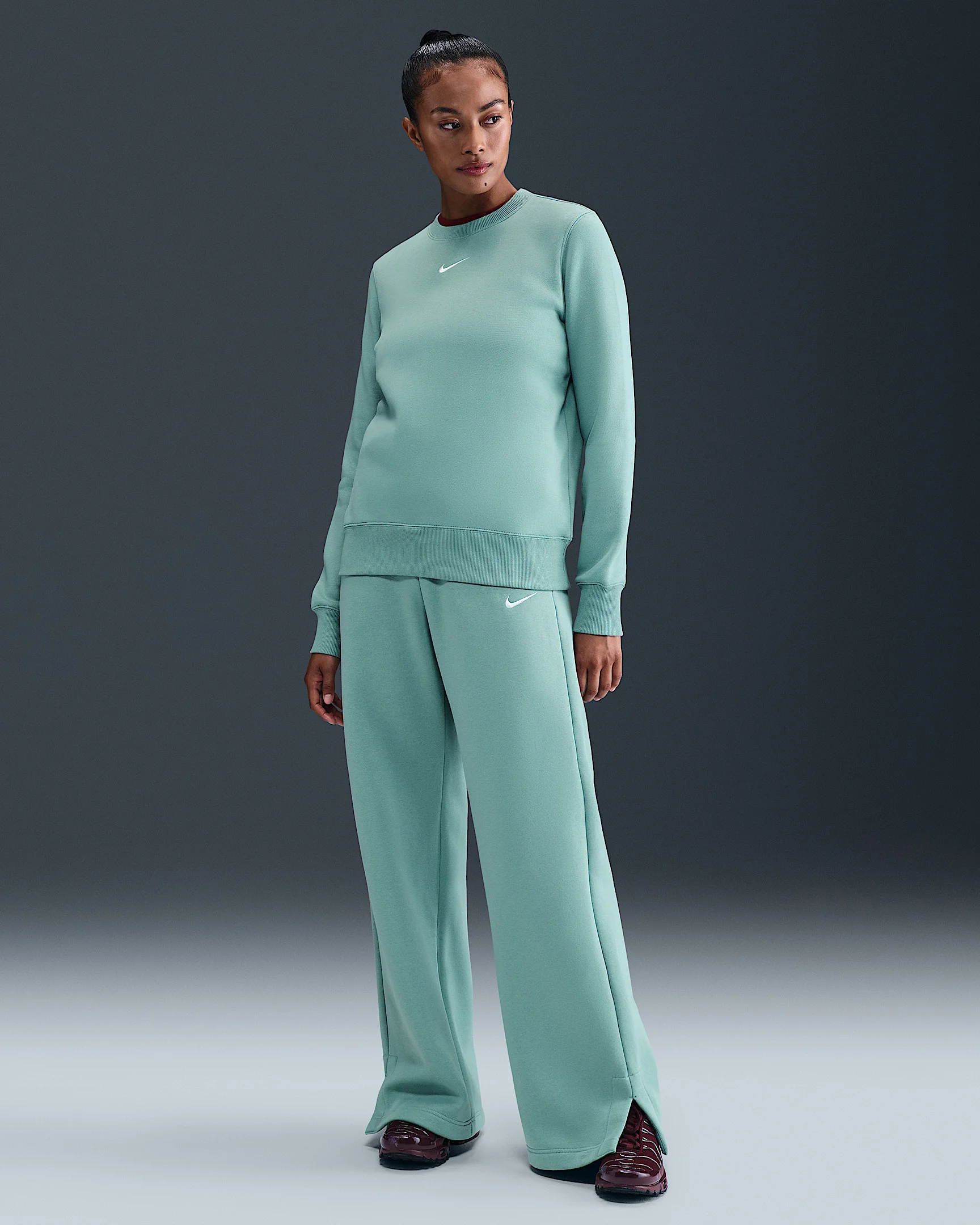 Made with midweight brushed fleece that feels extra soft on the inside and smooth on the outside, these wide-leg pants have an all-day cozy feel. Product Details - 80% cotton/20% polyester - Hand pockets - Side vents - Embroidered Swoosh logo on left thigh - Elastic waistband with drawcord - Machine wash - Imported - Shown: Cannon/Sail - Style: IH1011-017 SIZE & FIT Model is wearing size S and is 5′8″173cm Standard fit: easy and traditional Fl length: hits below ankle