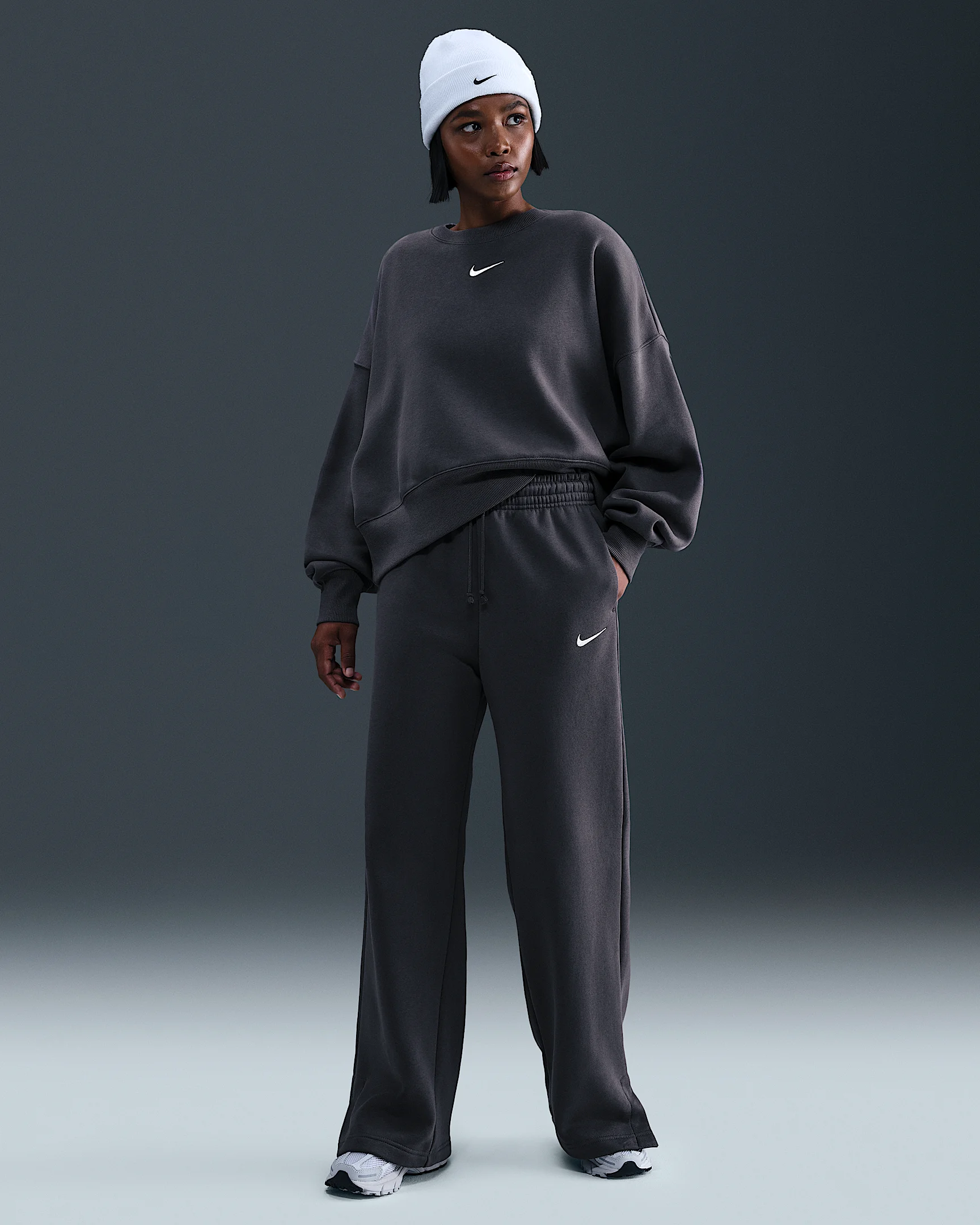 Made with midweight brushed fleece that feels extra soft on the inside and smooth on the outside, these wide-leg pants have an all-day cozy feel. Product Details - 80% cotton/20% polyester - Hand pockets - Side vents - Embroidered Swoosh logo on left thigh - Elastic waistband with drawcord - Machine wash - Imported - Shown: Thunder Grey/Sail - Style: IH1011-036 SIZE & FIT Standard fit: easy and traditional Fl length: hits below ankle