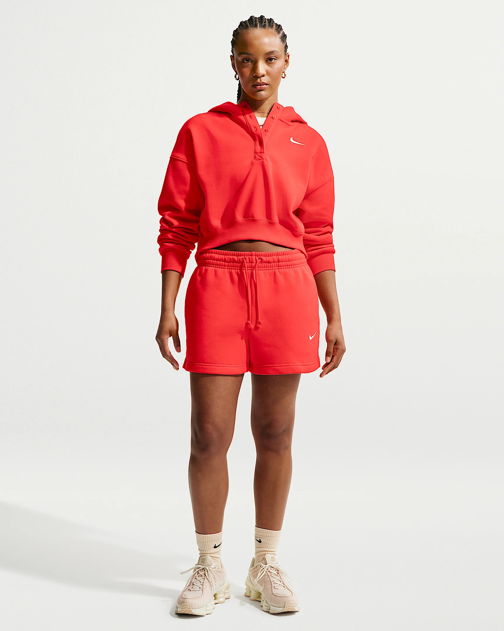 Extra soft on the inside and smooth on the outside, these cozy fleece shorts are elevated by exaggerated finishes like an elongated drawcord. Product Details - Body: 80% cotton/20% polyester. Pocket bag knuckle side: 100% cotton. - Embroidered Swoosh logo on left thigh - Hand pockets - Machine wash - Imported - Shown: Light Crimson/Sail - Style: IH2108-696 SIZE & FIT Model is wearing size S and is 5′7″170cm Standard fit: easy and traditional