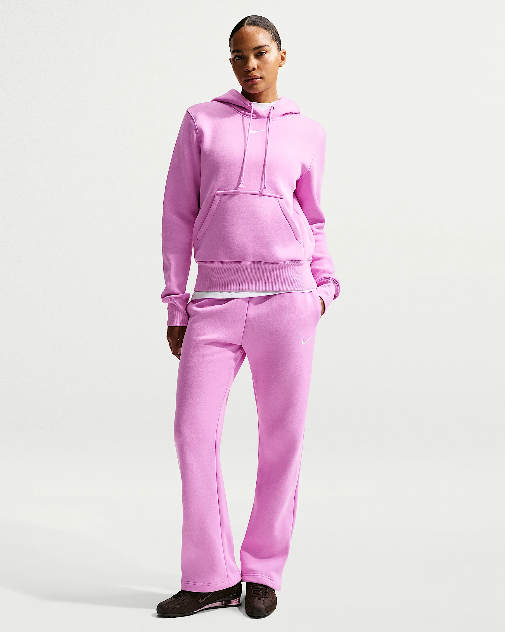 Made with midweight brushed fleece, these open-hem pants are extra soft on the inside and smooth on the outside for a comfortable, elevated feel. Product Details - 80% cotton/20% polyester - Elastic waistband - Pockets - Embroidered Swoosh logo on left thigh - Machine wash - Imported - Shown: Light Magenta/Sail - Style: HQ7723-503 SIZE & FIT Model is wearing size S and is 5'11"179cm Standard fit: easy and traditional Fl length: hits below ankle