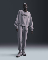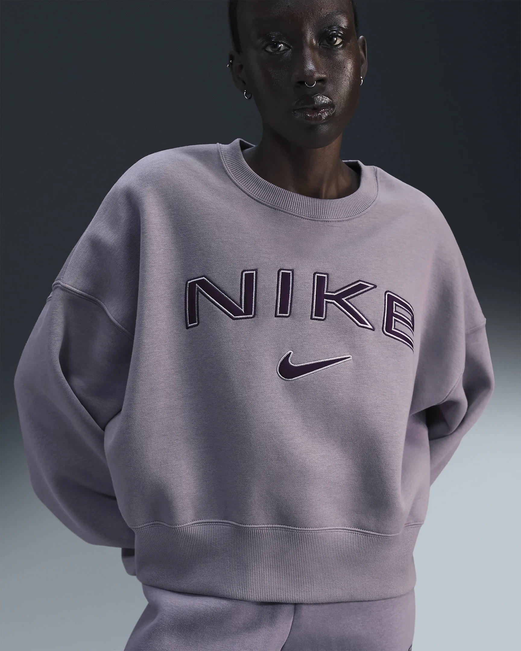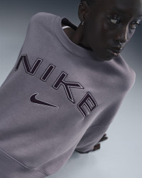 Grounded in style, comfort and versatility, meet our take on luxury loungewear. This sweatshirt's voluminous fit and slightly cropped length come together to give you an easygoing look that's anything but basic. Benefits - Dropped shoulders and extra room through body gives you bold, relaxed look. - Elongated ribbing at the cuffs and hem provides extra comfort and structure. - Our midweight brushed fleece feels extra soft on the inside and smooth on the outside, helping you stay cozy while keeping its structured shape. Product Details - Body: 80% cotton/20% polyester. Rib: 97% cotton/3% spandex. - Satin applique on chest - Machine wash - Imported - Shown: Light Violet Ore/Platinum Violet/Burgundy Crush - Style: FV7674-226 SIZE & FIT Model is wearing size S and is 5′9″175cm Oversized fit: exaggerated and spacious